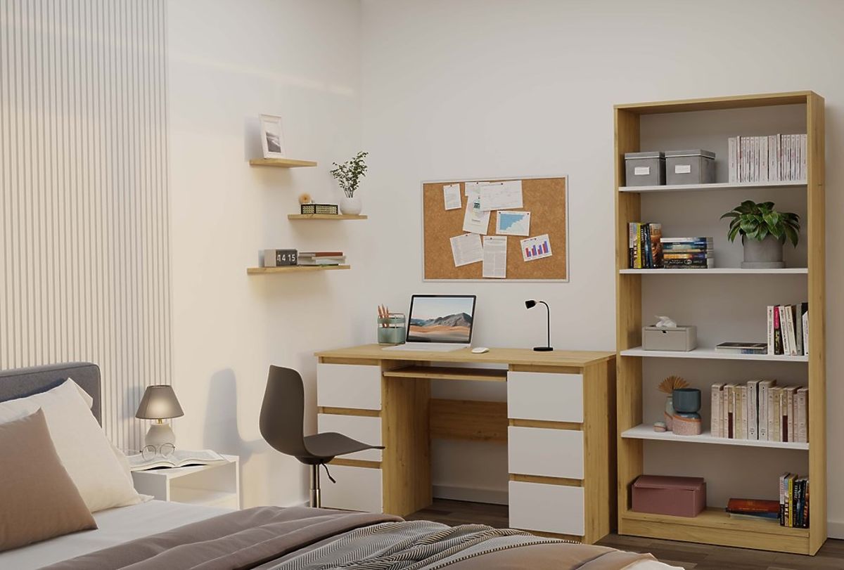 The R80 shelf is a stylish and practical solution for storing books, files, decorations, and office materials. The combination of the warm shade of artisan oak with contrasting white shelves gives the furniture a modern and elegant character. It is perfect for an office, living room, children's room, or home library.