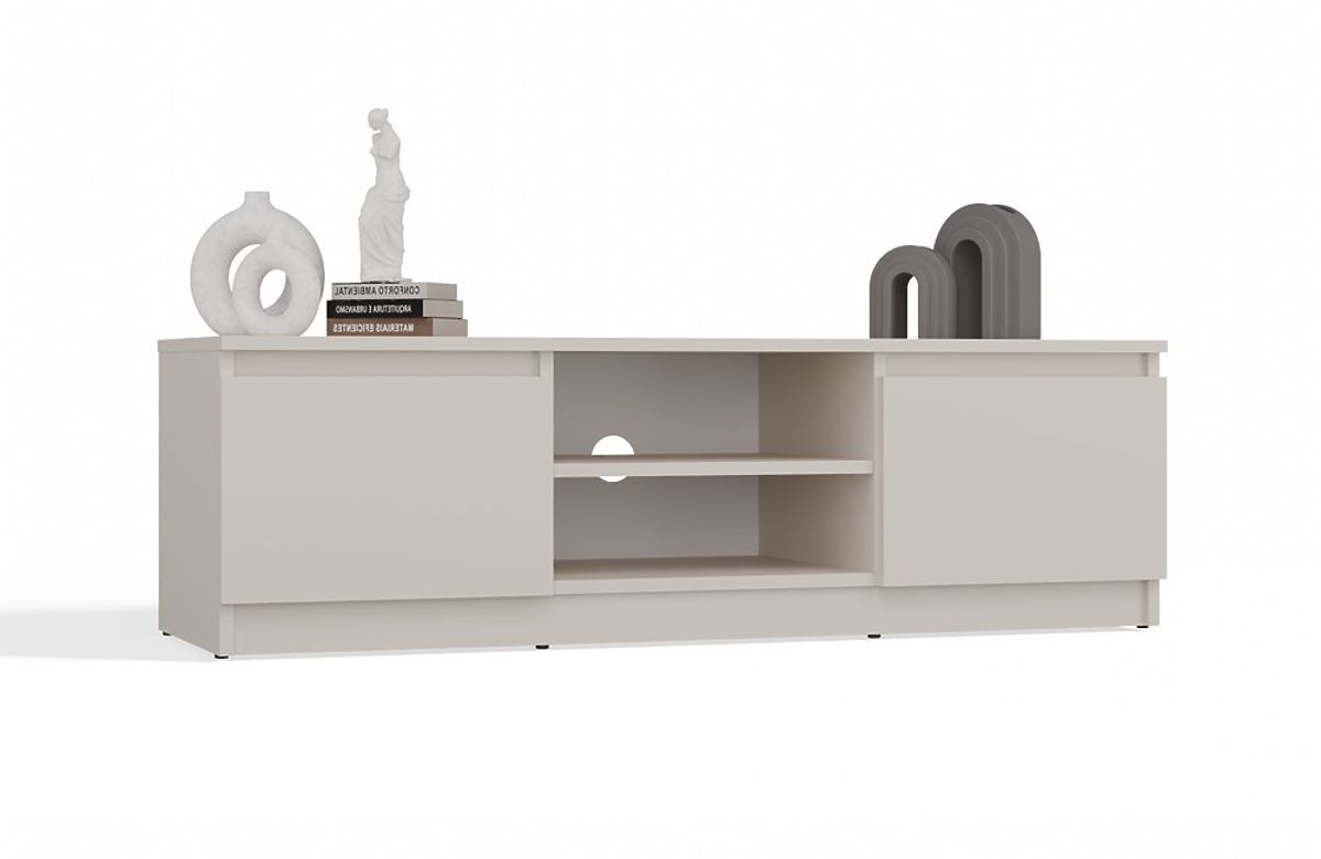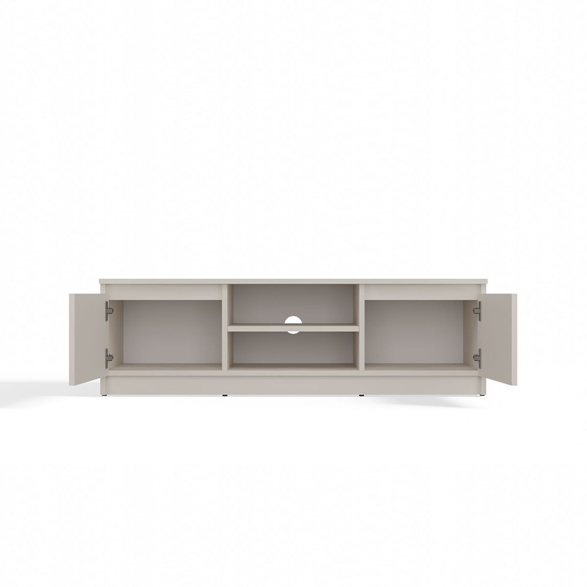 Two side cabinets without shelves inside for convenient storage of various devices and small items.