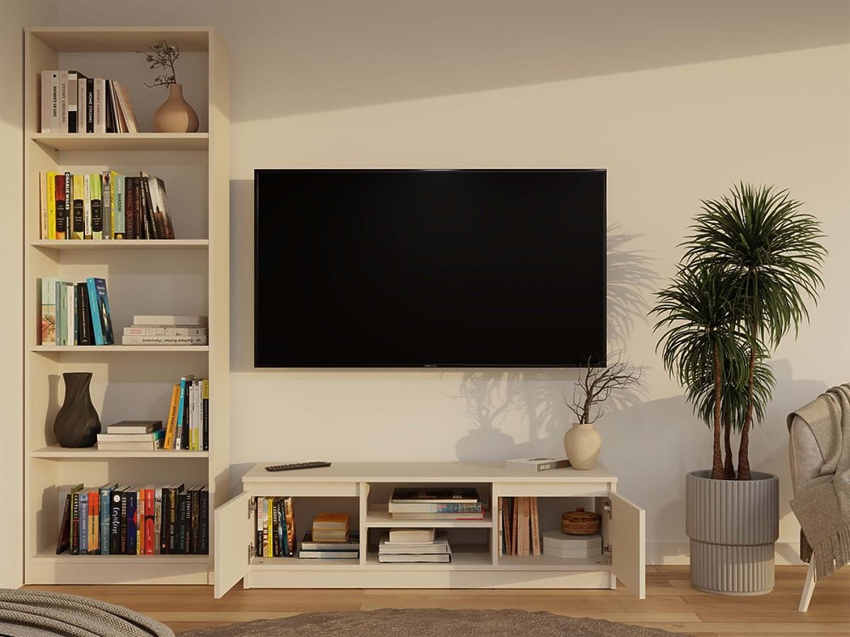 Open shelf allows convenient placement of TV equipment, and an opening at the back facilitates discreet cable management.