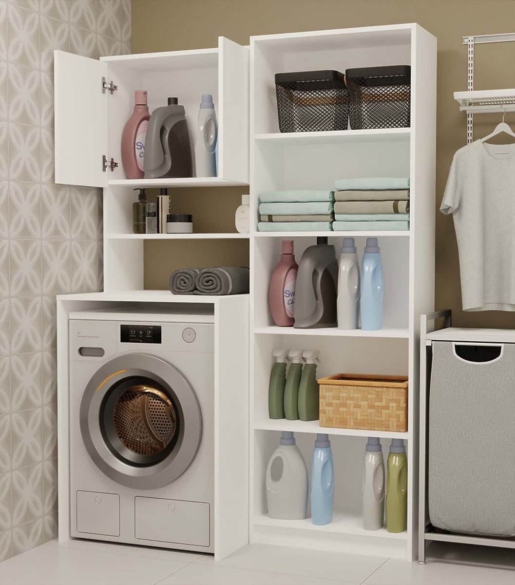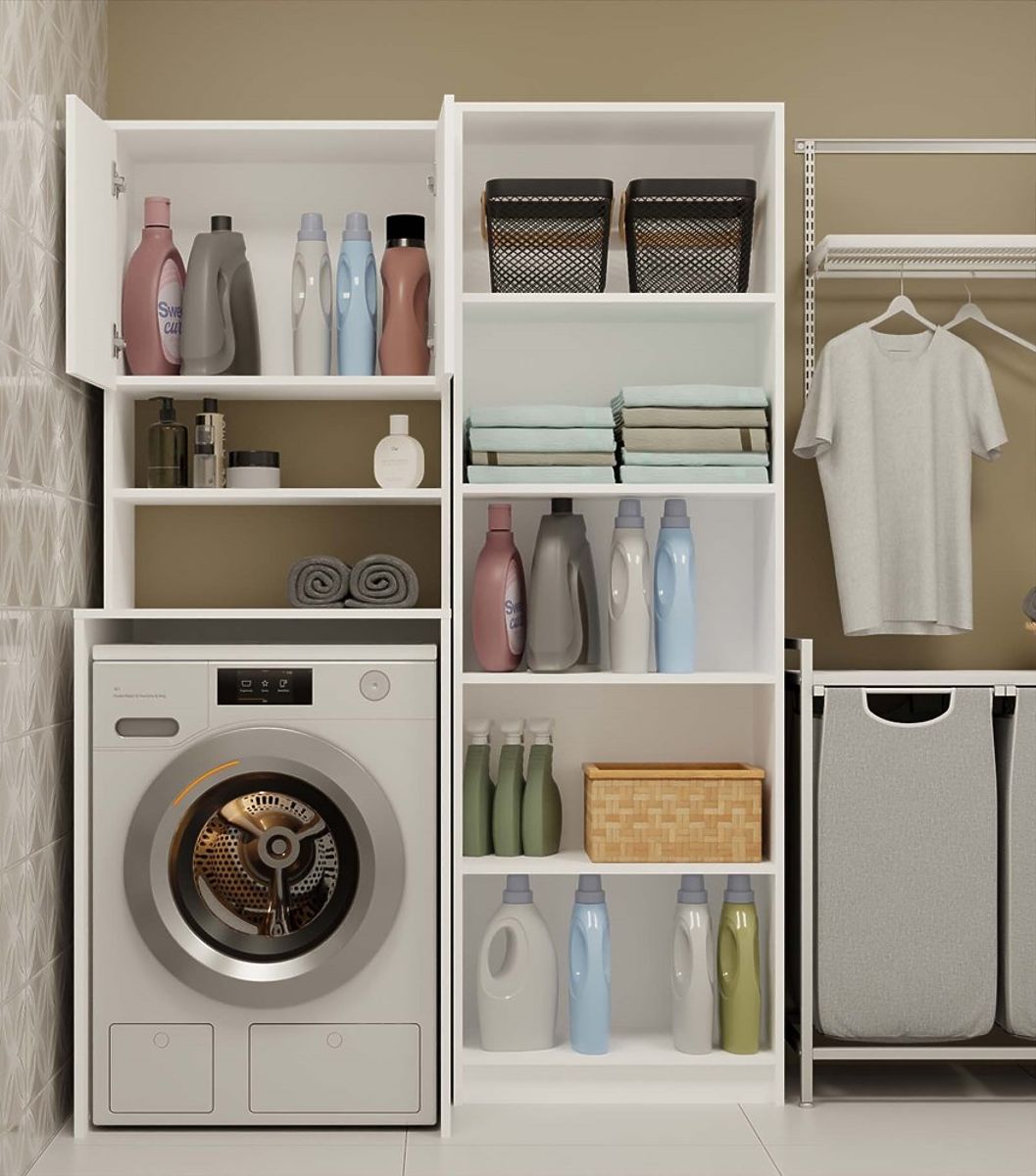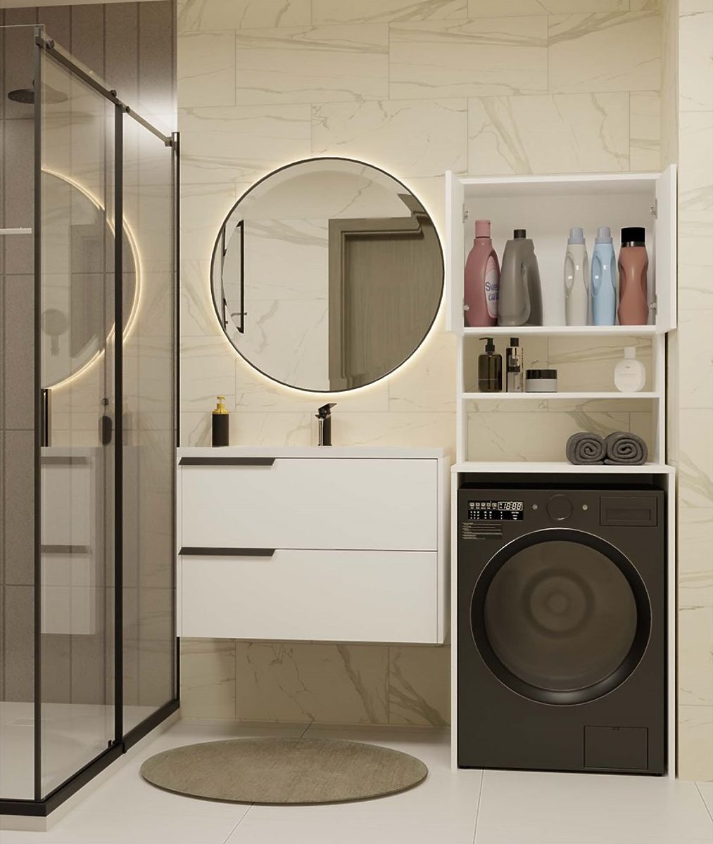 Bathroom shelf above washing machine maximizes space. .. more