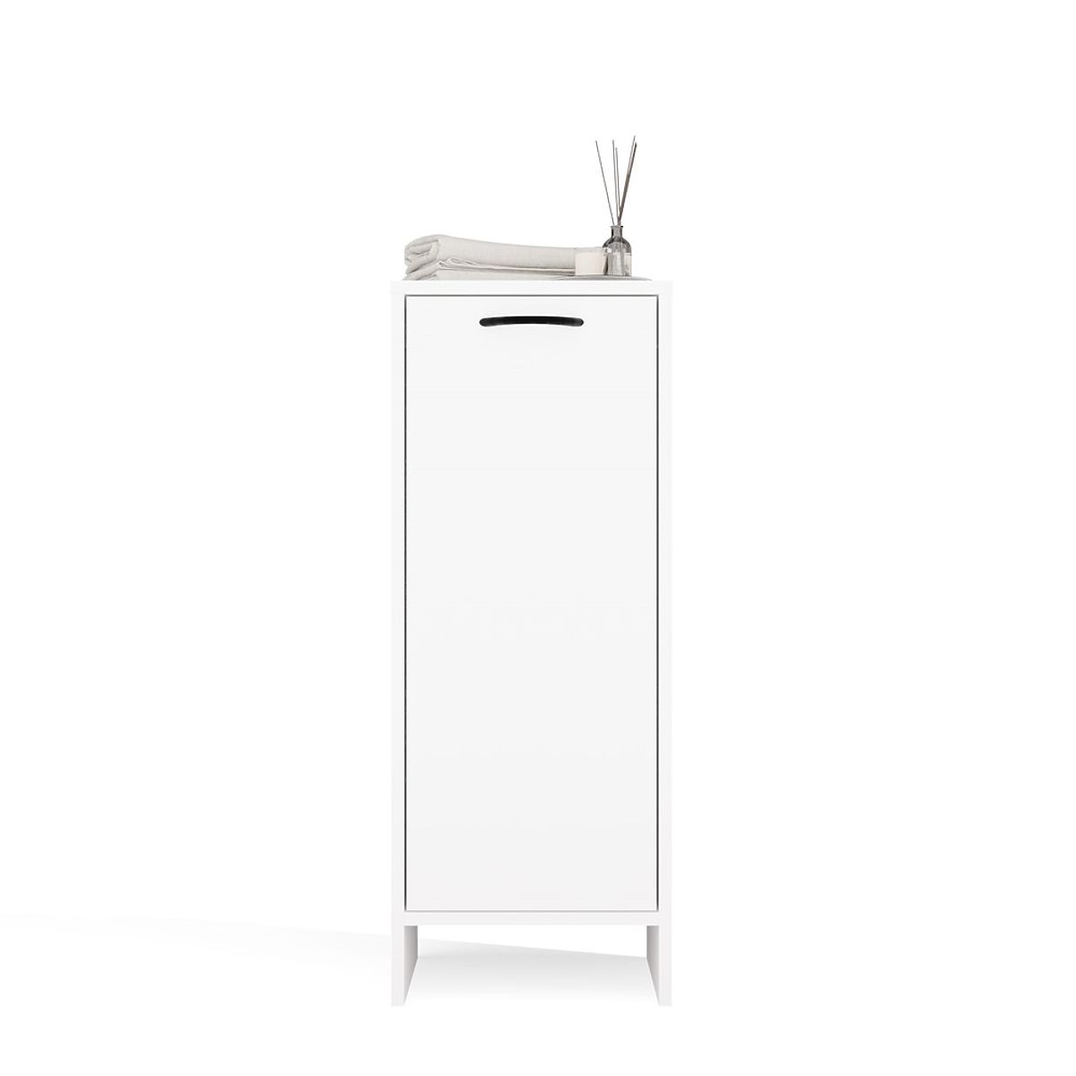 Compact white cabinet with a laundry basket for space-saving bathroom storage. .. more