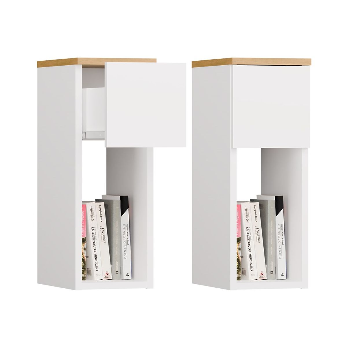 Modern nightstand with drawer and open shelf in white and artisan oak. .. more