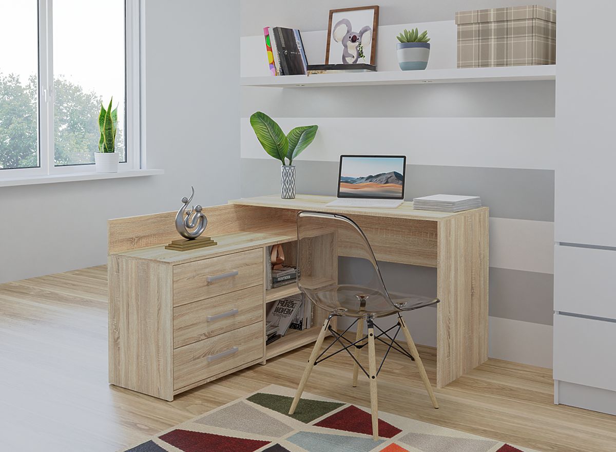 The corner writing desk with 3 drawers is a functional solution for those who need ample workspace and convenient organization of essential work tools.