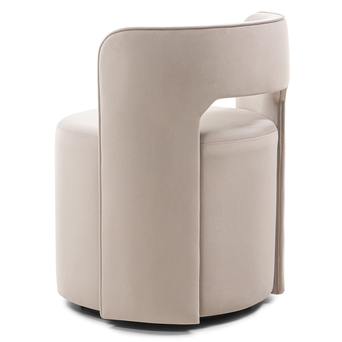Beige velvet swivel chair with a decorative backrest cutout. .. more