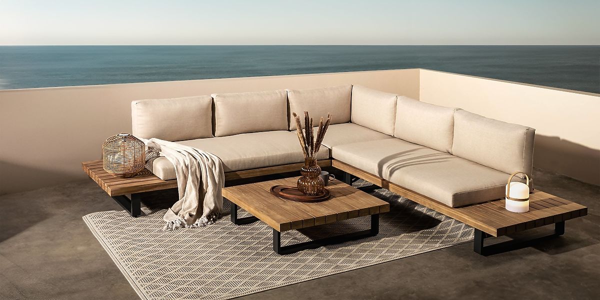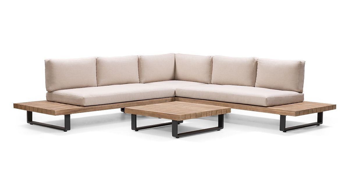 Lukahome.eu   »   Garden furniture   /   Garden sofas   /   Garden Corner Sofa with Table Borgo, Acacia Wood FSC, Teak Look, Beige