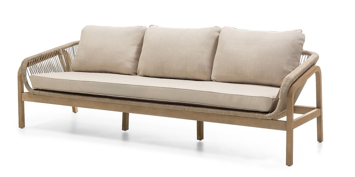 The set consists of a three-seater sofa, two armchairs, and a coffee table. Thanks to its robust construction and quality materials, it is suitable for outdoor use.
