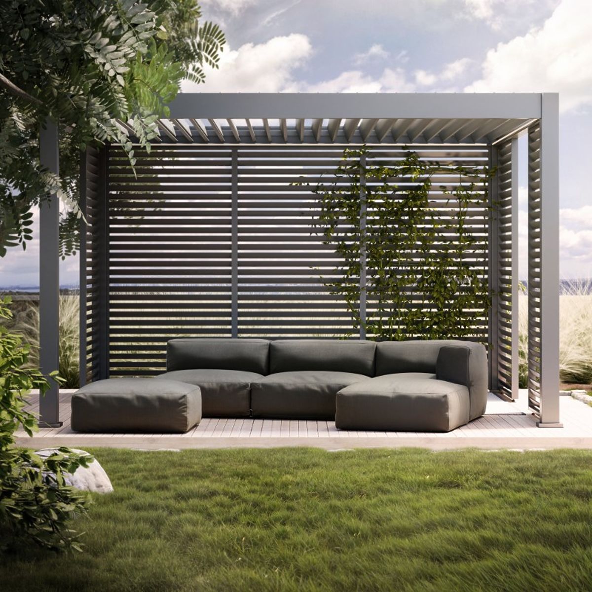Modular corner for garden sofa with water-resistant gray cover. .. more