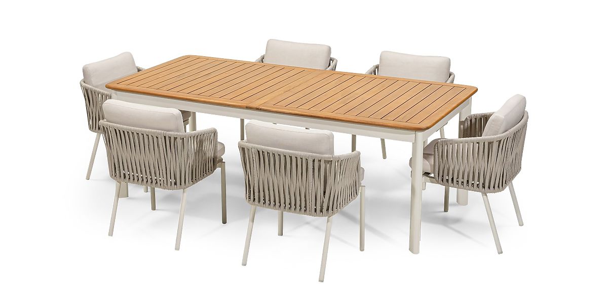 The Porticato garden set is the quintessence of modern design and user comfort. It consists of an extendable table and six stylish chairs, which together create a functional and aesthetic space for relaxation in the fresh air. The light beige color scheme, combination of wood and metal, and carefully selected details ensure that the set perfectly matches both the greenery of the garden and a modern terrace. Both the Porticato table and chairs have a lightweight yet sturdy construction made of powder-coated aluminum in light beige. This solution guarantees resistance to corrosion and mechanical damage. The extendable table top, made of durable acacia wood with a teak finish, allows easy adjustment of its length to the number of guests and the occasion. Another advantage is the FSC® certificate, which confirms the wood's origin from responsibly managed sources. The chairs charm with exceptional comfort – thanks to woven backrests made of durable rope and soft cushions made of hydrophobic fabric. It is the perfect place to relax with a cup of coffee, a book, or during long conversations with loved ones. Furniture made from natural wood retains its characteristic properties, so all irregularities, abrasions, scratches, knots, cracks, gaps, holes, depressions, uneven edges, various wood patterns, color differences, and other irregularities in the structure are intentionally preserved during the manufacturing process. These features emphasize the authenticity of the material, giving each of our products a unique character, which may lead to differences in appearance compared to the presented photos. To maintain the set's perfect condition for a long time, it is recommended to store it in a dry and ventilated place under a shelter during the winter months, ensuring protection from weather conditions.