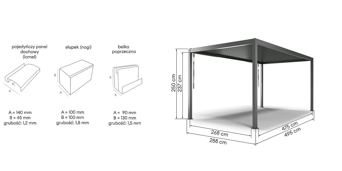 Discover unlimited relaxation and outdoor enjoyment possibilities with the Antilla garden pergola! This freestanding structure made of sturdy aluminum not only adds elegance and functionality to your garden but also creates a space for relaxation and unforgettable moments with loved ones. Its impressive size - 5x3 m - offers much greater functionality and flexibility compared to smaller models. The large space allows for different sections, such as dining and relaxation areas, creating a comfortable relaxation zone enriched with innovative solutions like audio systems or projection screens for movie watching. Due to its larger dimensions, the pergola becomes the heart of the garden or terrace, comfortably accommodating lounge sets and garden furniture. Such a solution ensures greater comfort during social gatherings and better separation from the surroundings, enhancing the sense of privacy. Additionally, the 3x5 m pergola can be used as a car shelter, protecting the vehicle from rain, snow, and harmful UV rays. Strength and elegance go hand in hand - the aluminum construction of the Antilla pergola not only charms with its modern design but also with its exceptional durability. It is corrosion-resistant and can withstand winds up to 120 km/h and snow loads up to 60 kg/m². Its roof consists of adjustable louvers, whose angle can be adapted to weather conditions using two convenient cranks. The panels not only regulate light access but also ensure 100% waterproofing when closed, effectively protecting against rain and excessive sunlight. Our pergola louvers are 100% aluminum - lightweight, corrosion-resistant, and extremely durable. Unlike steel solutions, they do not rust and do not burden the structure. Moreover, they ensure ideal air circulation, creating a comfortable atmosphere during use. The thoughtful design of the pergola allows for efficient rainwater drainage, and all system elements are discreetly hidden inside each of the four legs, maintaining an aesthetic appearance. The bioclimatic Antilla pergola has the necessary certifications confirming compliance with the highest standards, making it perfect for both private terraces and gardens, as well as commercial spaces like restaurants and hotel gardens. The pergola is intended for self-assembly - the set includes everything needed to create your own oasis of relaxation, and clear step-by-step instructions make the assembly process simple and satisfying. To make your relaxation even more enjoyable, you can equip your pergola with additional paid accessories. A curtain made of easy-to-clean white fabric not only provides additional sun protection but also transparency, creating an atmosphere of lightness and freedom. And if you care about comprehensive protection, choose a screen-type roller blind. Made of weather-resistant fabric, it protects against UV rays, light wind, rain, and insects, while offering pleasant shading. You can decide how and on how many sides of the pergola you want to mount curtains or blinds. To do this, select their quantity and size in the configurator to fit the wall width (475 and 268 cm). But that's not all! To immerse yourself in the magical evening atmosphere, choose mood LED lighting. You can choose between traditional with remote control and control box, or energy-saving solar lighting, which works thanks to a solar panel and built-in battery.
