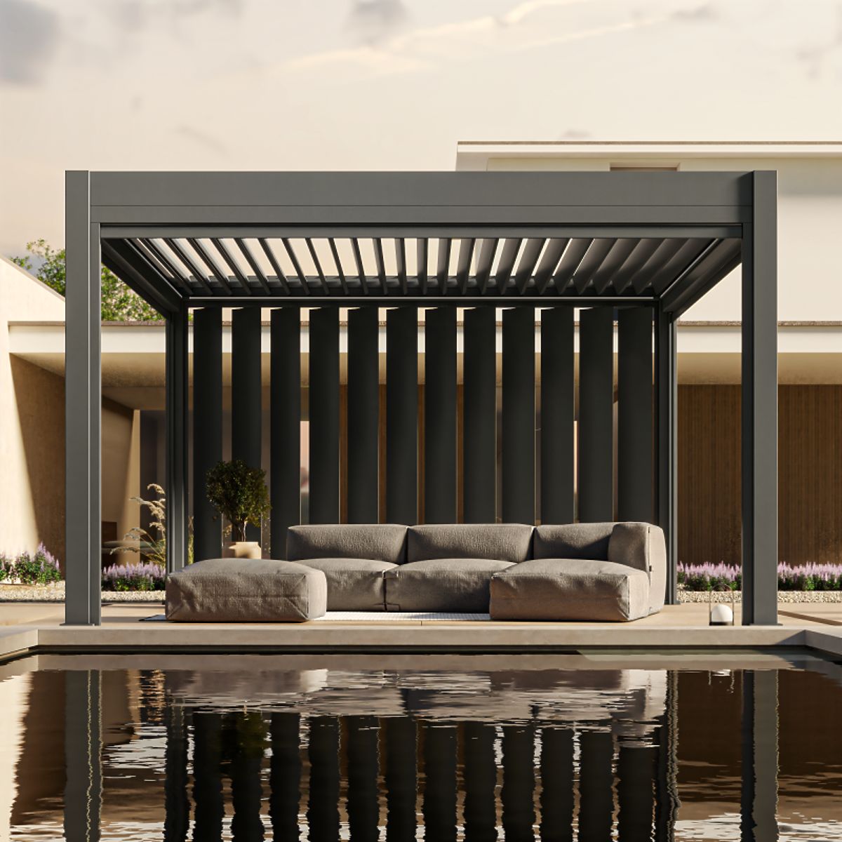 Bioclimatic aluminum pergola with LED lighting and remote-controlled slats. .. more