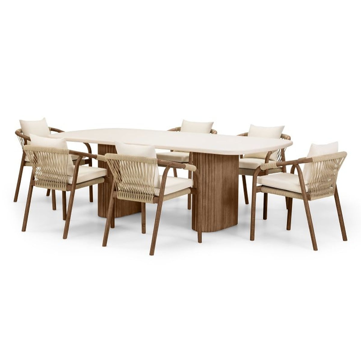 Create a space in your garden that captivates with both appearance and comfort! The Rovigo garden set is a unique combination of natural materials and original design, making every moment in the fresh air a pleasure. The centerpiece of the set is a table with a light beige top, made from the innovative Superstone material – a composite that perfectly imitates natural stone but is much more resistant to weather conditions and UV radiation. Its gently rounded edges add lightness, while the massive slatted legs made of acacia wood emphasize elegance and give a warm, natural character. The set includes six stylish chairs, whose rounded acacia wood frame ensures stability and durability. The woven backrests and seats, made from durable cord, not only attract attention but also ensure excellent air circulation. The set is completed with comfortable cushions that invite relaxation in the fresh air. The fabric used has hydrophobic properties, but to maintain its durability, we recommend storing it in a sheltered place during rain. Furniture made from natural wood retains its characteristic properties, so all unevenness, abrasions, scratches, knots, cracks, gaps, holes, dents, uneven edges, various textures, color differences, and other irregularities in the structure are intentionally preserved during the manufacturing process. These features highlight the authenticity of the material, giving each of our products a unique character, which may lead to differences in appearance compared to the presented photos. To keep the set in perfect condition for a long time, it is recommended to store it in a dry and airy place under a shelter during the winter months to protect it from weather conditions.