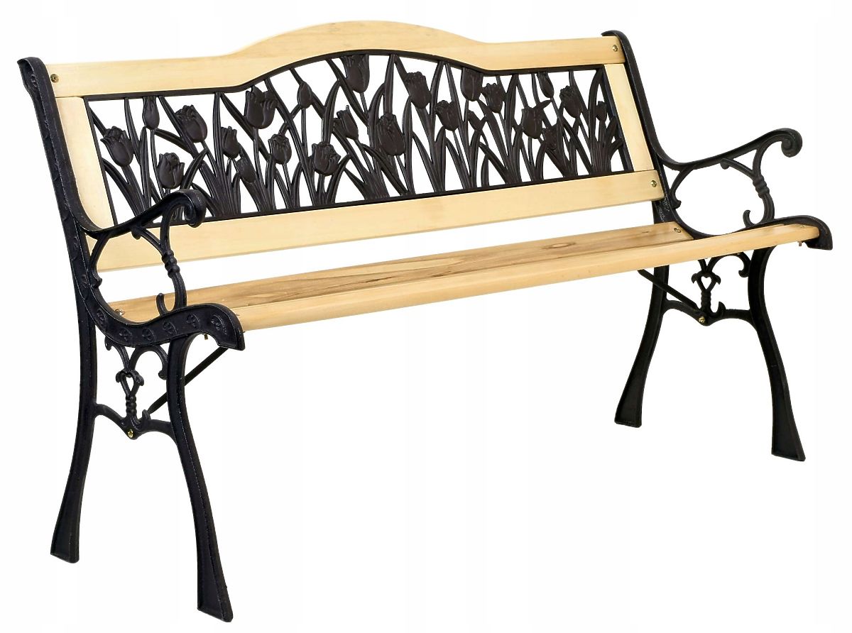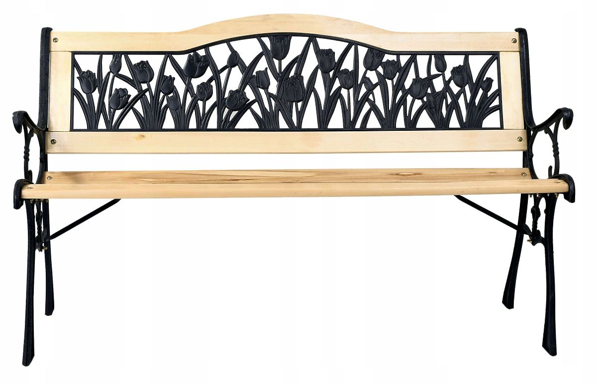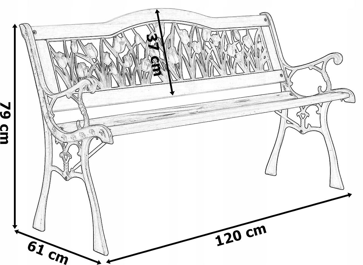 Cast Iron Garden Bench TULIP The classic design of the Tulip garden bench perfectly complements the beauty of your garden. The sturdy cast iron legs of the bench will last for many years, just like the beautiful wood from which the bench is made. Tulip is the ideal solution for garden enthusiasts, as well as for those running businesses with open-air spaces. Its elegant appearance will surely keep your garden or business guests lingering longer. Main Features Bench made of lacquered wood Cast iron sides with elegant decoration Backrest in tulip pattern made of durable plastic Easy assembly Classic style Technical Specifications Height: 79 cm Board thickness: 18 mm Seat depth: 34 cm Backrest height: 31.5 cm Seat height: 40 cm Depth: 61 cm Width: 120 cm Additional Information The colors shown are indicative and may differ from actual colors due to different monitor settings and photo editing processes. Actual dimensions may vary from those listed above. Error tolerance may be +/- 5%. Brand: OGRODOVIA Product Code: 063707MG EAN Code: 5905523063707 Color: black Height: 79 cm Width: 120 cm Backrest Height: 31.5 cm Leg Span: 61 cm