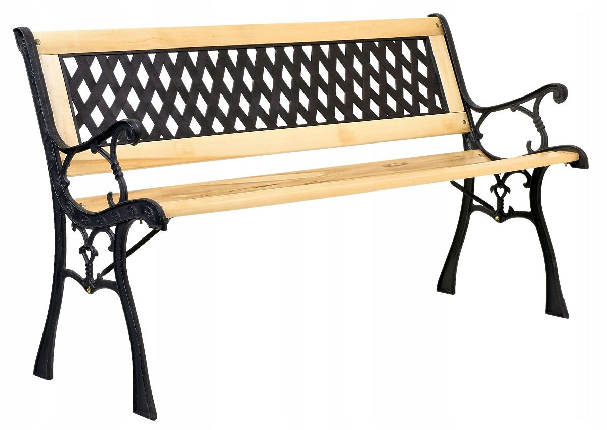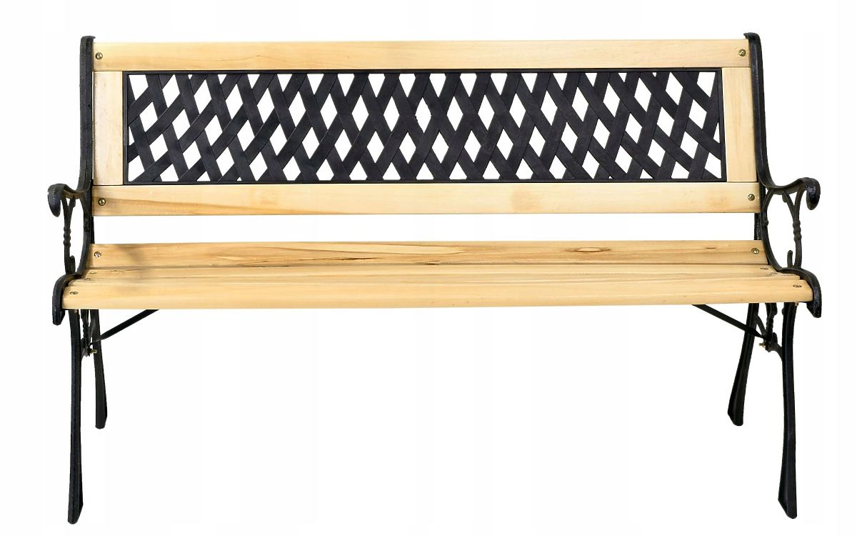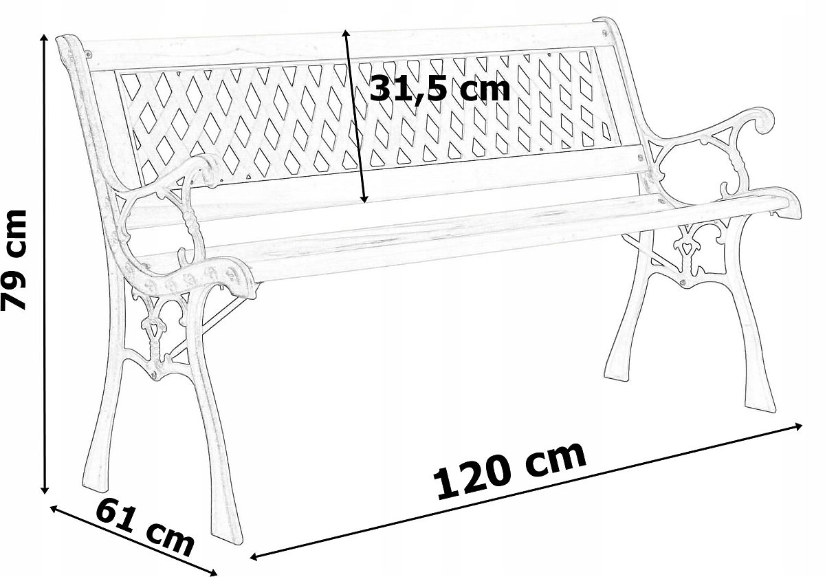 Cast Iron Garden Bench KARO The classic design of the Karo garden bench perfectly complements the beauty of your garden. The sturdy cast iron legs of the bench will last for many years, as will the beautiful wood from which the bench is made. Karo is an excellent solution for garden enthusiasts as well as for those running businesses with open-air spaces. Its elegant appearance will surely keep the guests of your garden or business lingering longer. Main Features Bench made of lacquered wood Cast iron sides with elegant decorations Backrest with diamond pattern Easy assembly Classic style Technical Specifications Height: 79 cm Board thickness: 18 mm Seat depth: 34 cm Backrest height: 31.5 cm Seat height: 40 cm Depth: 61 cm Width: 120 cm Additional Information The displayed colors should be considered as indicative - they may differ from the actual ones due to different monitor settings and photo editing processes. Actual dimensions may vary from those listed above. Error tolerance may be +/- 5%. Brand: OGRODOVIA Product Code: 063714MG EAN Code: 5905523063714 Color: Black Height: 79 cm Width: 120 cm Backrest Height: 31.5 cm Leg Span: 61 cm