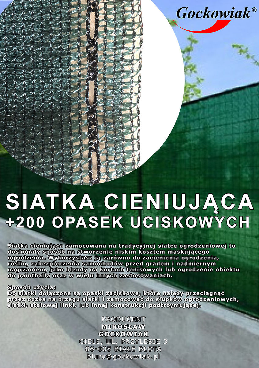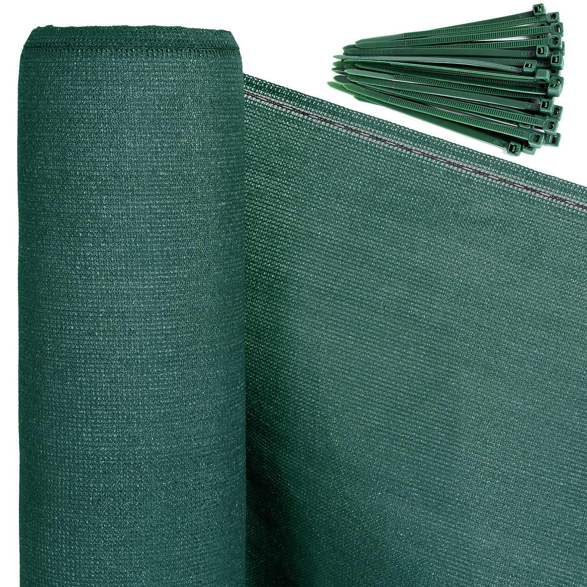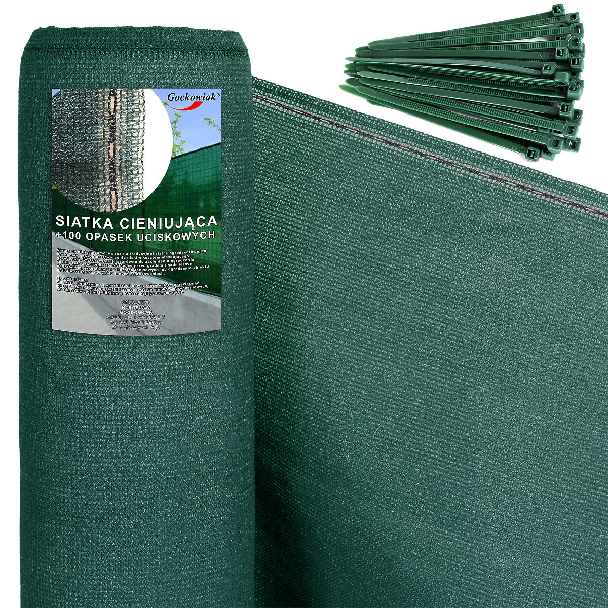 Shade Net 135g 1.5 X 50 m Green Purpose: garden, greenhouse | Color: green The shade net is an excellent way to create a camouflage fence at low cost. Its main function is to limit visibility and light access while maintaining proper ventilation. The net is densely woven, made from the highest quality HDPE and PP materials. It includes a UV filter that strengthens and extends its lifespan. It reduces up to 90% of sunlight. The version is reinforced with polypropylene seams near the mounting eyes. The package includes 200 cable ties. The net is folded into compact dimensions for transport. Product Features Size: 1.5m x 50m Color: green Shading: 90% Weight: 135g/m2 Material: HDPE and PP Cable ties: 200 pcs UV protection: UV protection Tear resistance: yes Mounting holes: yes (top and bottom) Advantages of using the net: Shading and camouflaging fences. Protecting plants from animals: insects, birds. Protecting plants from adverse weather conditions Protecting cars from hail and excessive heating Protecting tennis courts from wind Fencing objects for paintball Protecting construction scaffolding Additional Information The presented colors should be considered indicative - they may differ from actual ones due to different monitor settings and photo editing processes. Actual dimensions may differ from those listed above. Error tolerance may be +/- 5%. Brand: Gockowiak EAN code: 5902340321652 Color: green Height: 150 cm Width: 50 meters Material: HDPE Shading: 90%