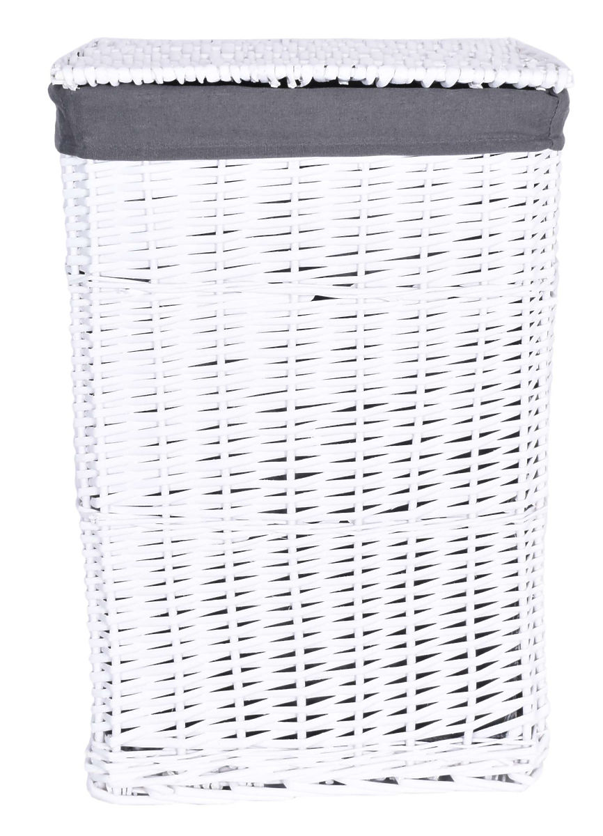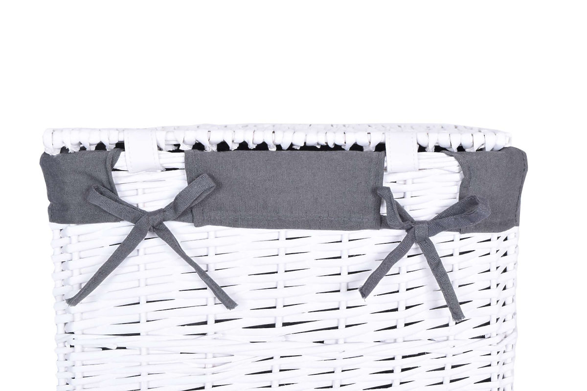 Handmade wicker basket crafted from natural wicker, chalk-painted in white. The basket's insert is linen, in grey color.