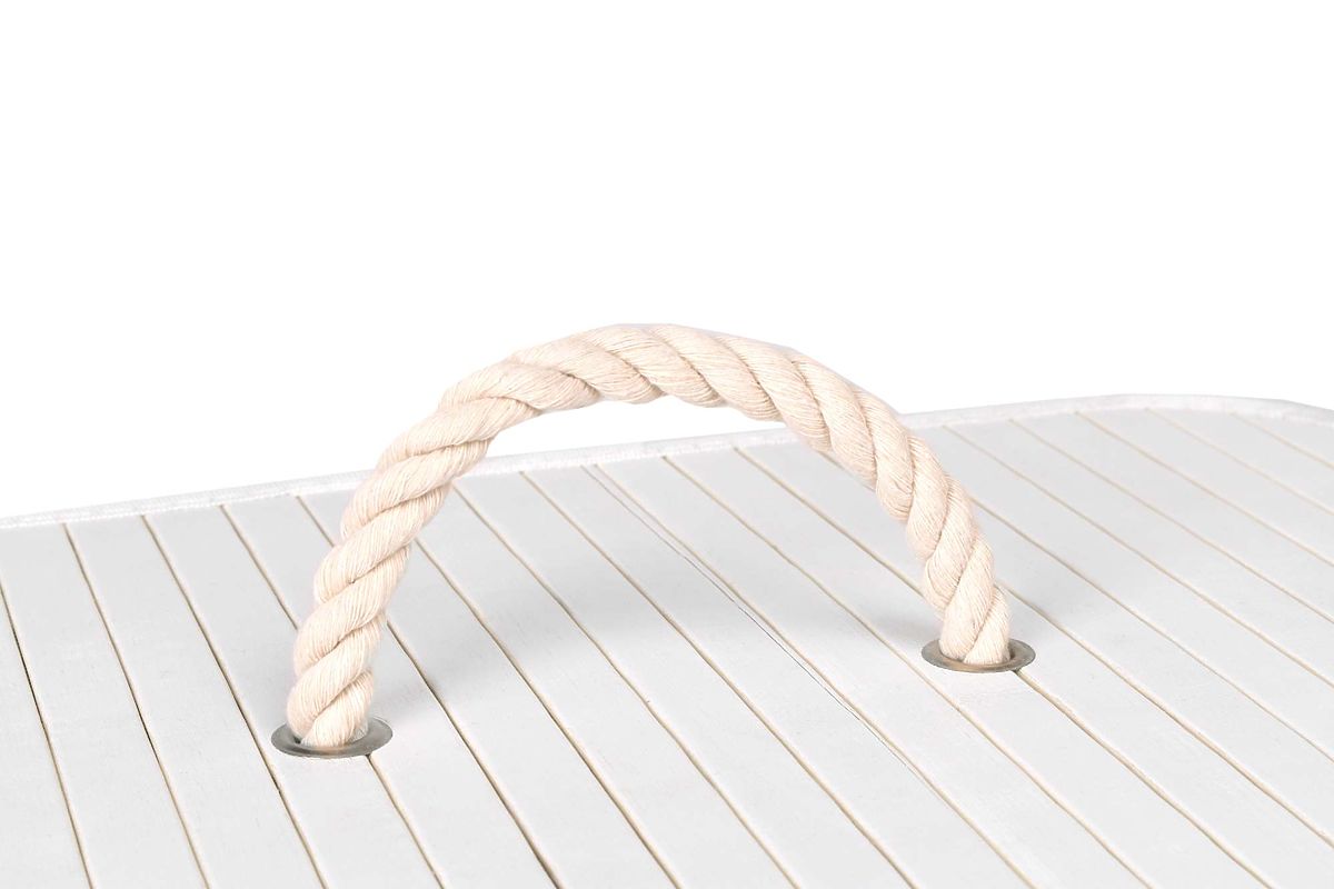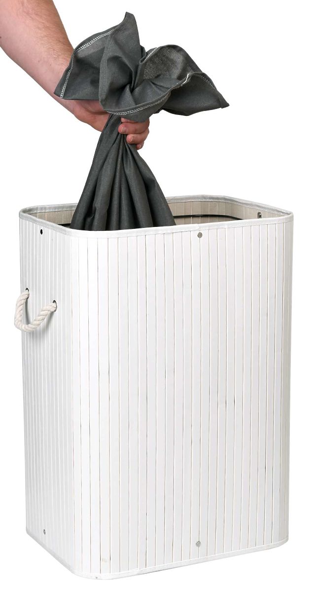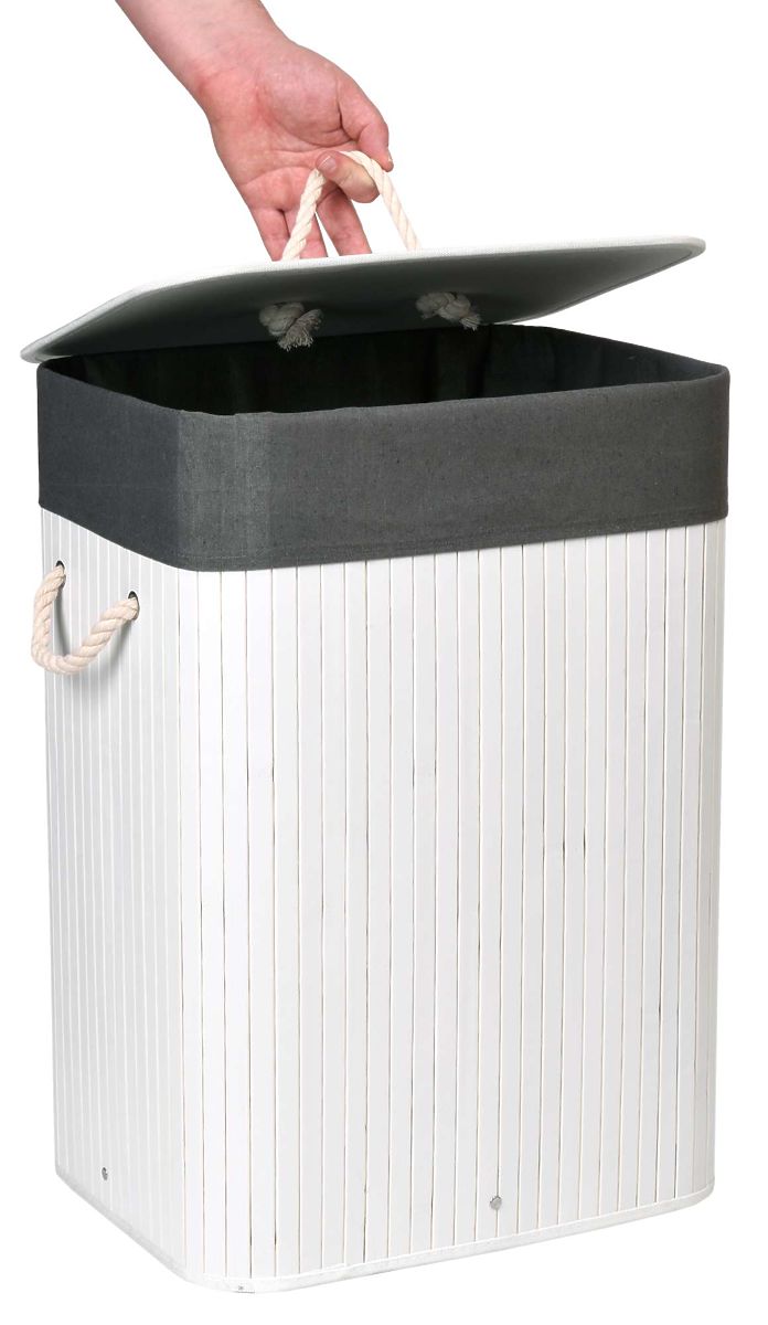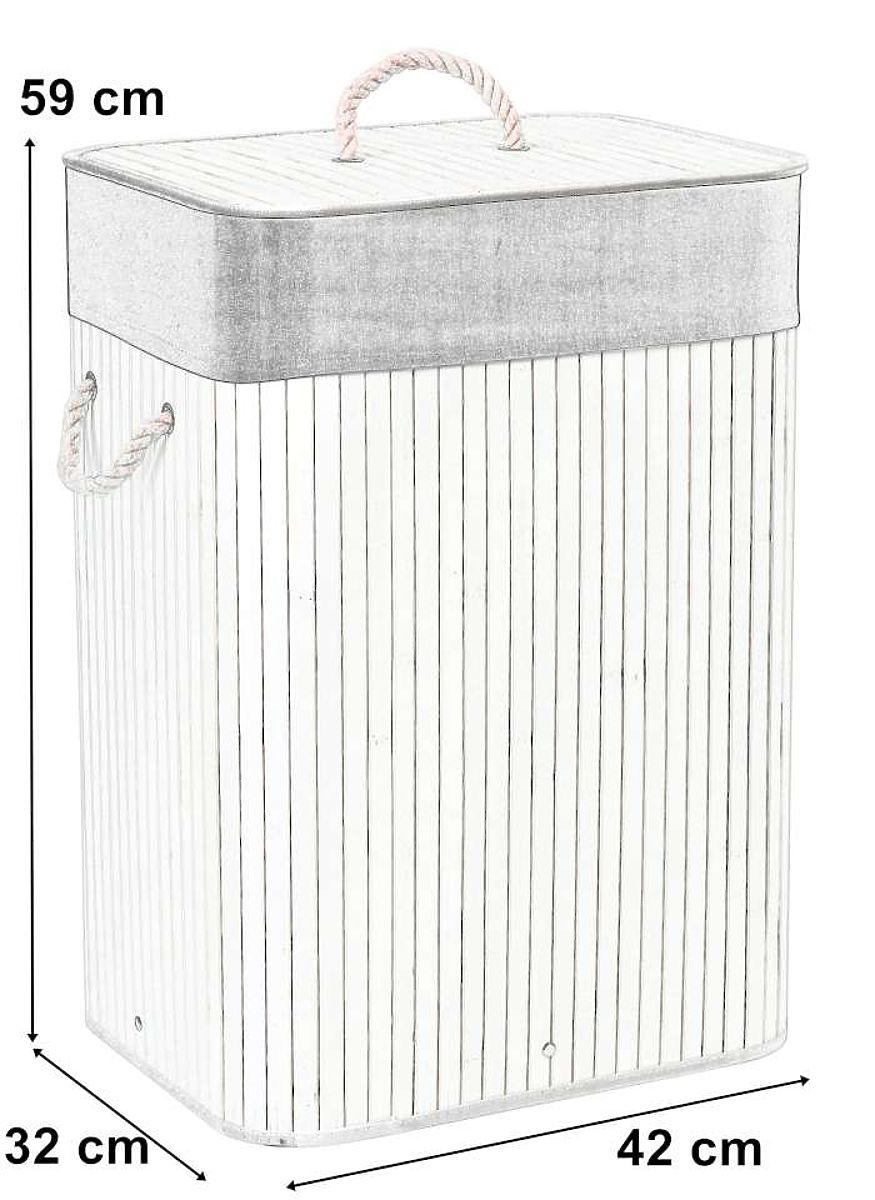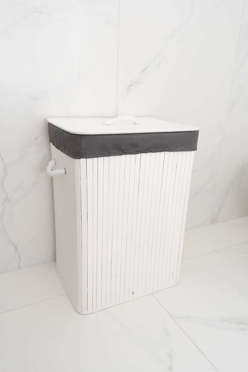 Corner Bamboo Laundry Basket with Lid Capacity: 80 liters | Color: White-Grey The most beautiful and durable, stylish laundry basket with a capacity of 80 liters. Made from natural bamboo. Inside is a fabric bag. Simple construction, sturdy structure. Conceals unpleasant odors. Allows for convenient and quick washing. Product Features Made from natural bamboo Designed for bathroom, laundry room, or bedroom Large capacity Interior lined with soft material Convenient lid with rope handle Two rope handles for easy carrying Modern, natural pattern Product Dimensions Height: 59 cm Width: 42 cm Depth: 32 cm Capacity: 80 liters Additional Information The colors shown are indicative and may differ from the actual ones due to different monitor settings and photo editing processes. Actual dimensions may vary from those listed above. Error tolerance may be +/- 5%. Brand: Gockowiak Product Code: 317129MG Color: White | Grey Height: 59 cm Width: 42 cm Depth: 32 cm Purpose: Bathroom | Dressing Room | Bedroom