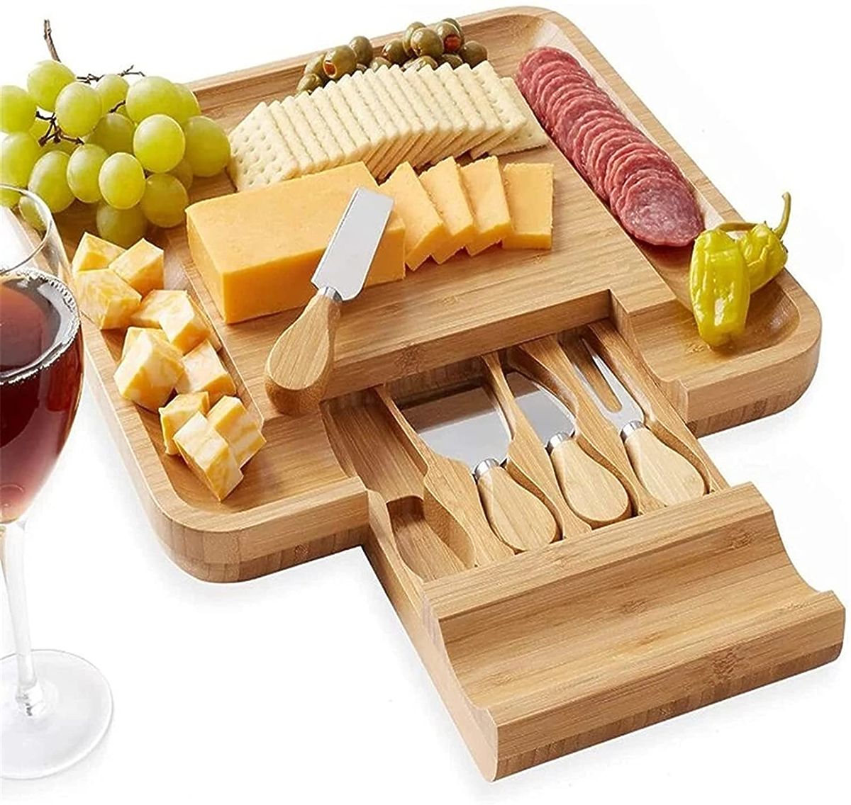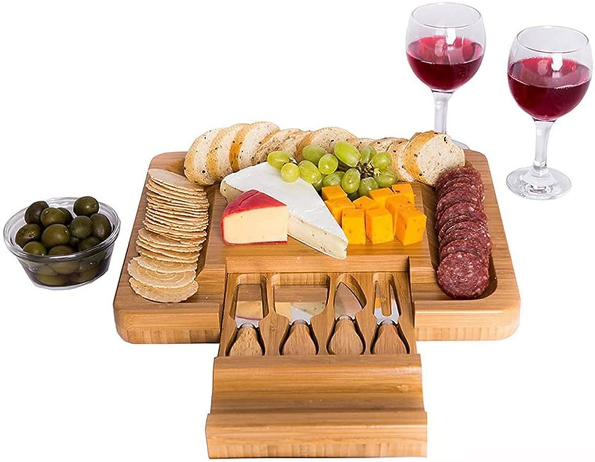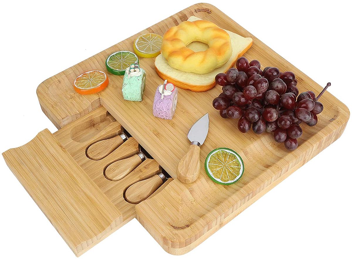 Bamboo board with stainless steel knives for elegant snack serving. .. more