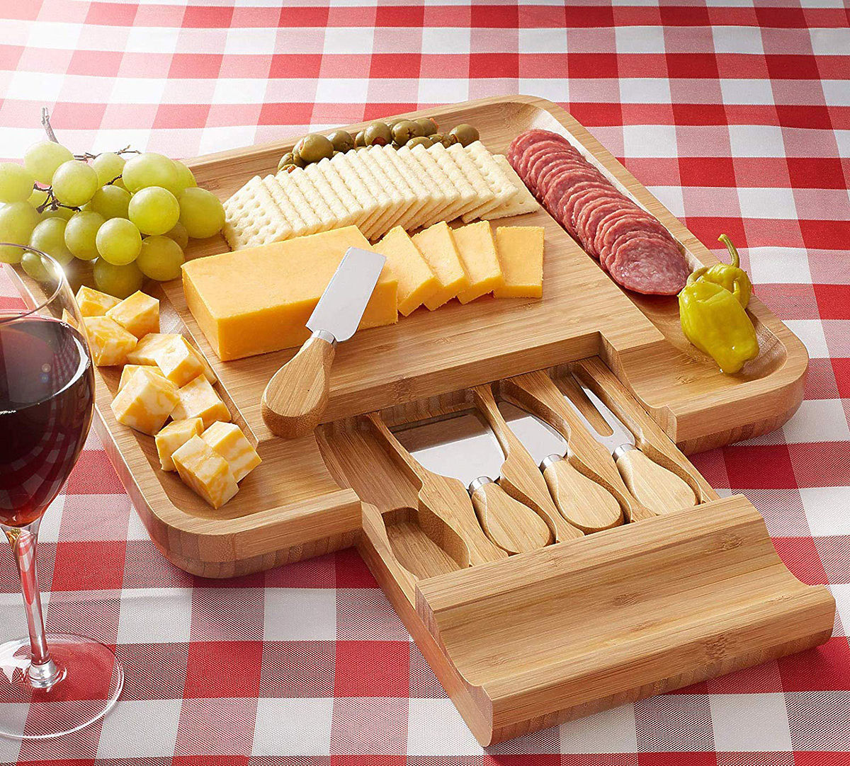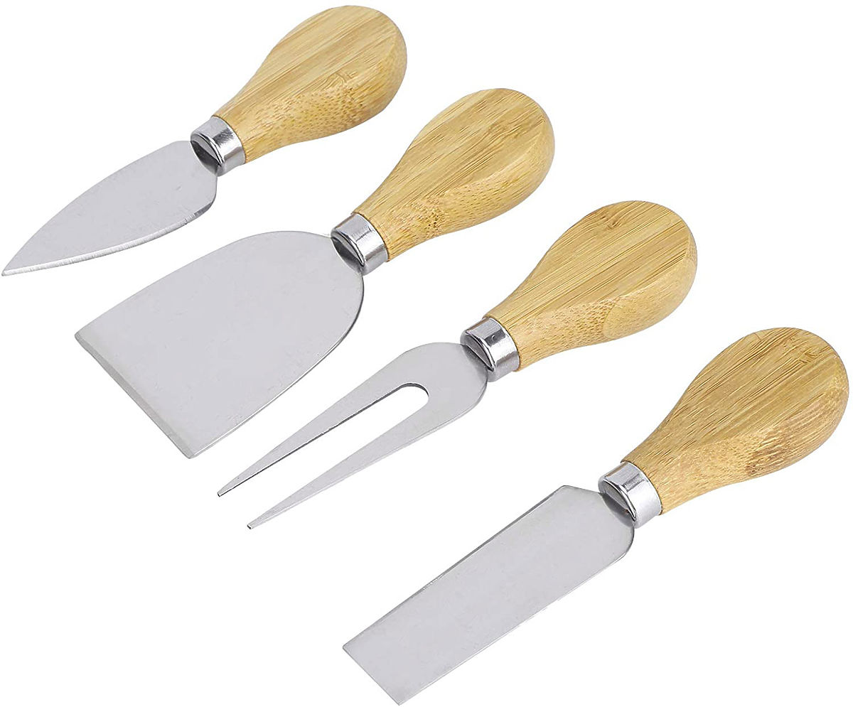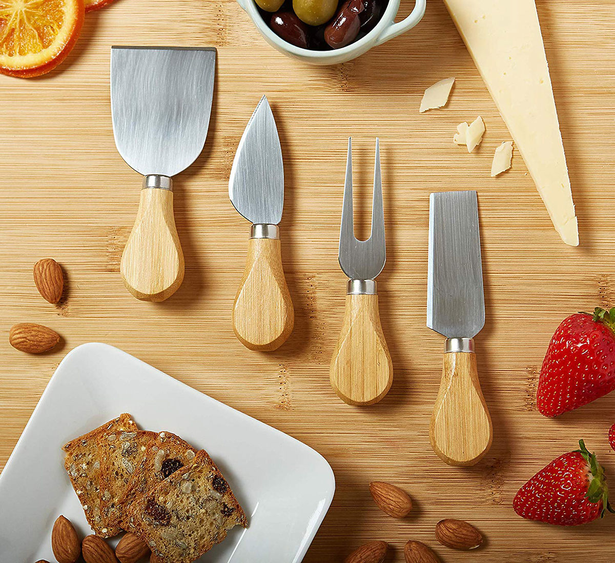 Bamboo board with stainless steel knives for elegant snack serving. .. more
