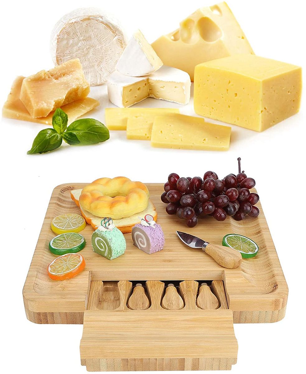 Estera Bamboo Snack and Cheese Board Purpose: Elegant serving of snacks | Colors: Natural bamboo Made from 100% high-quality bamboo wood. A great gift idea for cheese lovers and more. The board is equipped with a drawer containing a set of stainless steel knives. Grooves on the edges allow for an impressive arrangement of snacks and side dishes. Additional accessories make it easier to serve and cut snacks and maintain order on the table. The board is perfect for any party or gathering with friends. It will be a great gift accessory. Product Features Material: 100% bamboo Non-slip rubber feet Set includes: board + stainless steel cutlery set Dimensions: 33x33x4 cm Product Dimensions Width: 33 cm Depth: 33 cm Height: 4 cm (4.5 cm with feet) Cutlery handle: 6 x 3 cm Additional Information The colors shown are indicative - they may differ from the actual ones due to different monitor settings and photo editing processes. Actual dimensions may vary from those listed above. Error tolerance may be +/- 5%. Brand: Gockowiak EAN product code: 5902340323175 Color: Natural Height: 33 cm Width: 33 cm Thickness: 4 cm Drawer width: 19 cm