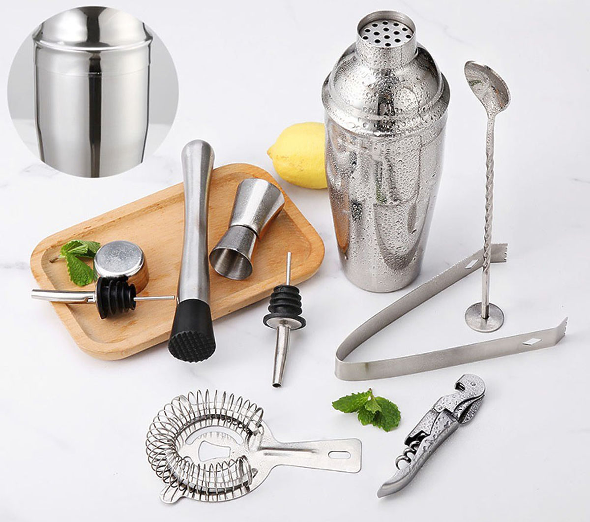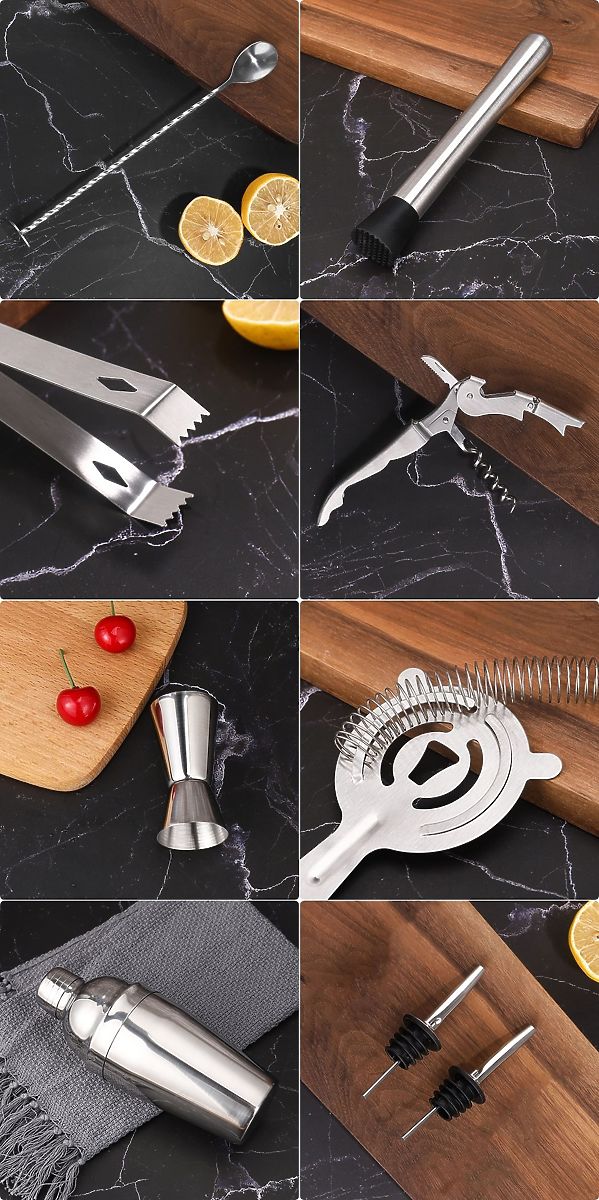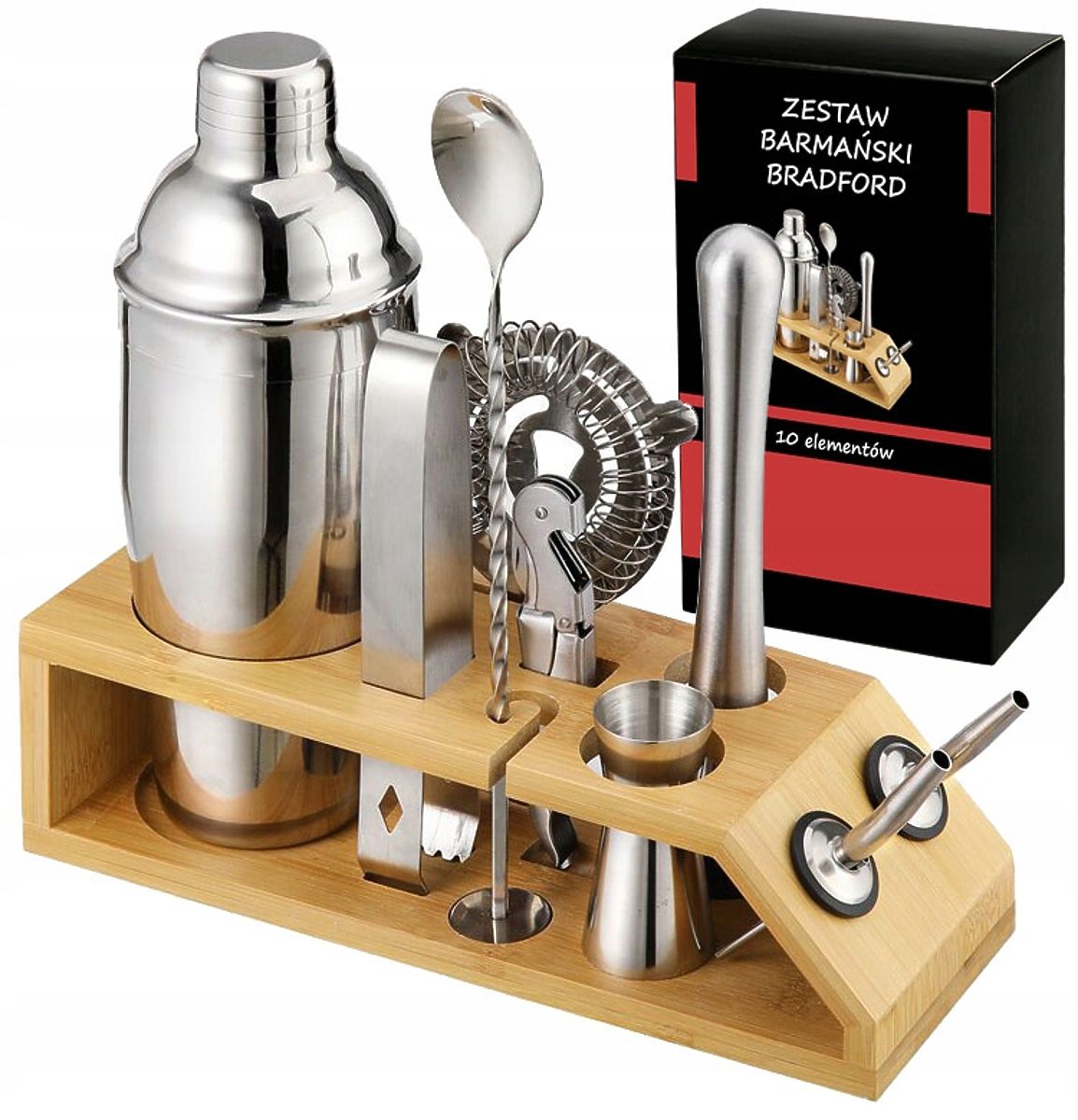 BRADFORD Bartender Set for Drinks - 10 Pieces Purpose: Creating excellent drinks and beverages | Color: Chrome If you want to give yourself or someone else an exceptional gift, you are in the right place. The Bradford bartender set consists of a carefully crafted bamboo stand and nine stainless steel accessories. This is important information because steel does not react chemically and does not alter the taste of the served drinks and beverages. Thanks to this, they taste exactly as they should. Product Features High-quality 304 stainless steel Set includes up to 10 pieces Does not alter the taste of beverages Great gift idea Steel elements are dishwasher safe Set Elements: A 1x Long Bartender Spoon B 1x Three-Piece Shaker 750ml C 1x Bamboo Stand D 1x Bartender Muddler E 1x Bartender Strainer F 1x Ice Tongs G 2x Pourers H 1x Corkscrew/Opener I 1x Double-Sided Jigger 15/30ml Additional Information The colors shown are indicative - they may differ from the actual ones due to different monitor settings and photo editing processes. Actual dimensions may differ from those stated. Error tolerance may be +/- 5%. Brand: Gockowiak EAN Code: 323335MG Color: Chrome Material: Stainless Steel Stand: Natural Bamboo Number of Pieces: x10 Dishwasher Safe: Yes