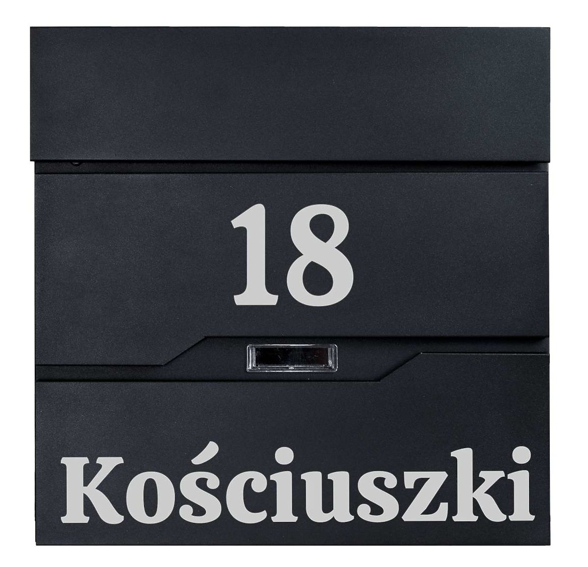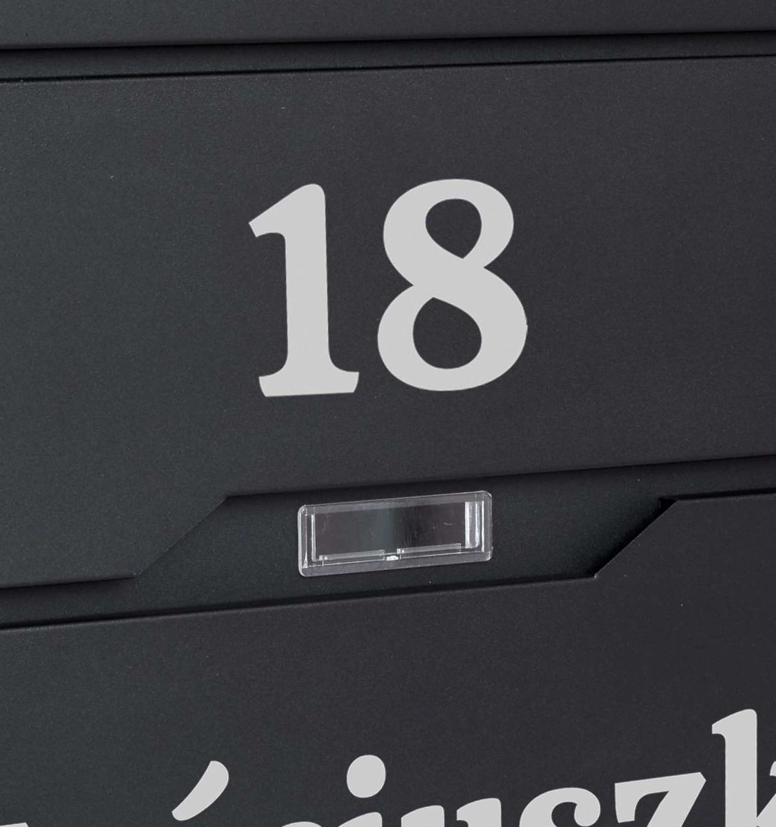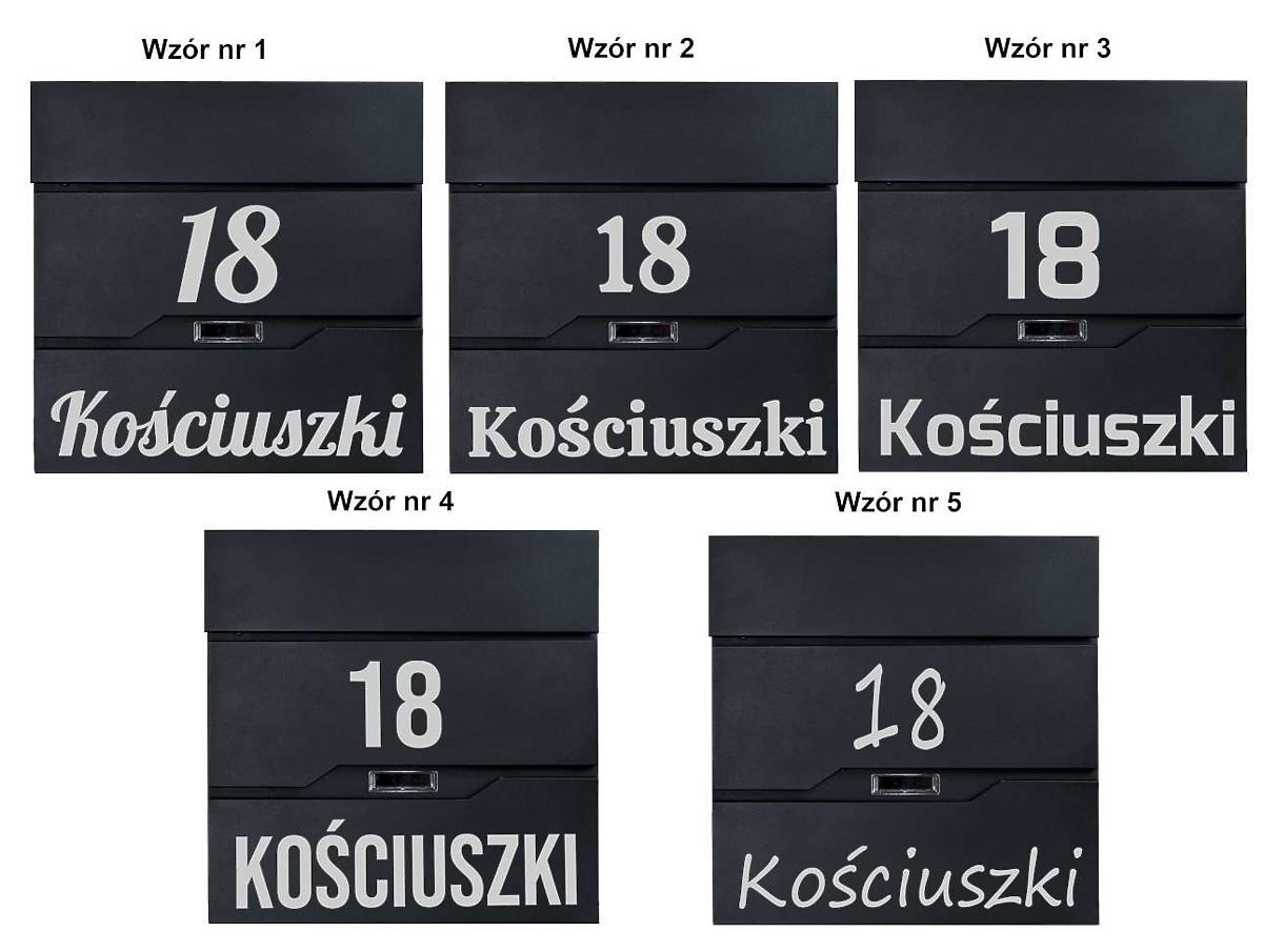Option to create any inscription: house number, company name, surname, street, etc. The inscription is created using the Oracal foil plotting method, weather-resistant. The foil is in silver color.