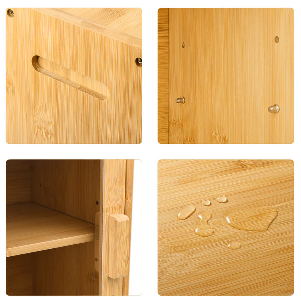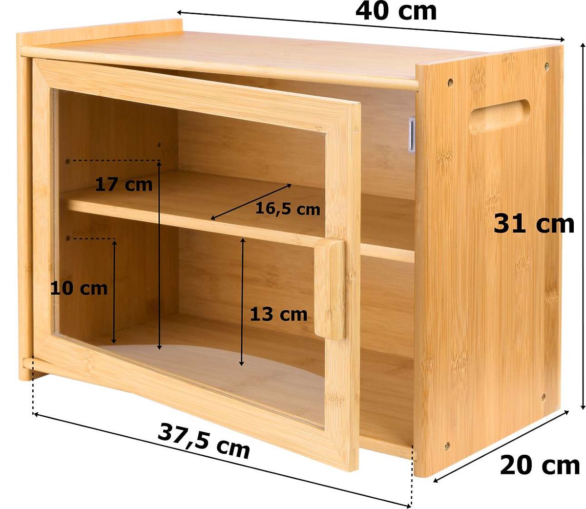 Bamboo Bread Box Pierre, Bread Container Purpose: Office, Bathroom | Colors: Natural Pierre is a two-tier bamboo bread box made from 100% bamboo wood. The transparent plexiglass window allows for quick identification of baked goods. The bread box features carved handles for easy carrying. The height of the inner shelf can be adjusted as needed. The shelf can be removed and used as a cutting board once taken out. The bread box is crafted with the highest quality materials, with attention to every detail. It is aesthetically finished with smooth and rounded edges. Product Features Material: Wood, Plastic, Metal Type of Wood: 100% Bamboo Wood Lock Type: Magnetic Surface: Smooth and Lacquered Weight with Packaging: 3.5 kg Color: Natural NOTE - PRODUCT FOR SELF-ASSEMBLY. Product Dimensions Height: 31 cm Width: 40 cm Depth: 20 cm Additional Information The colors shown are indicative and may differ from the actual ones due to different monitor settings and photo editing processes. Actual dimensions may vary from those listed. Error tolerance may be +/- 5%. Brand: Gockowiak EAN Code: 325414MG Color: Bamboo Height: 31 cm Width: 40 cm Depth: 20 cm Material: Bamboo