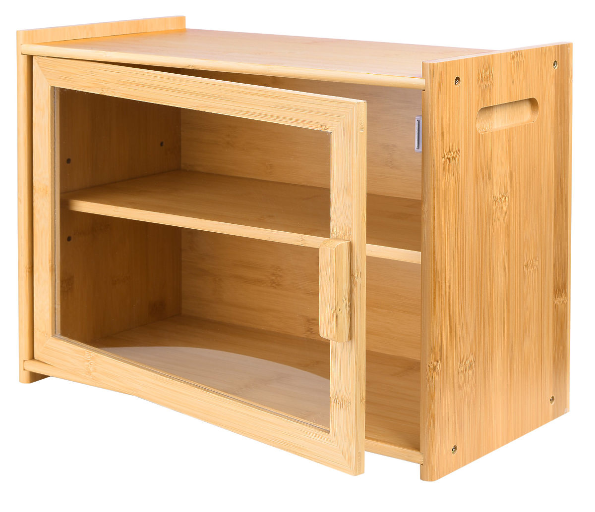 Two-tier bamboo bread box with adjustable shelf and plexiglass window. .. more