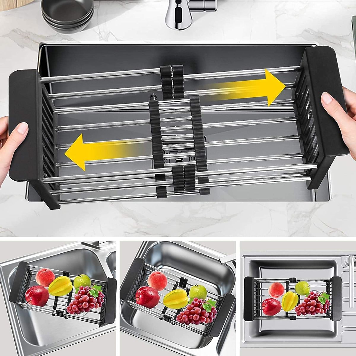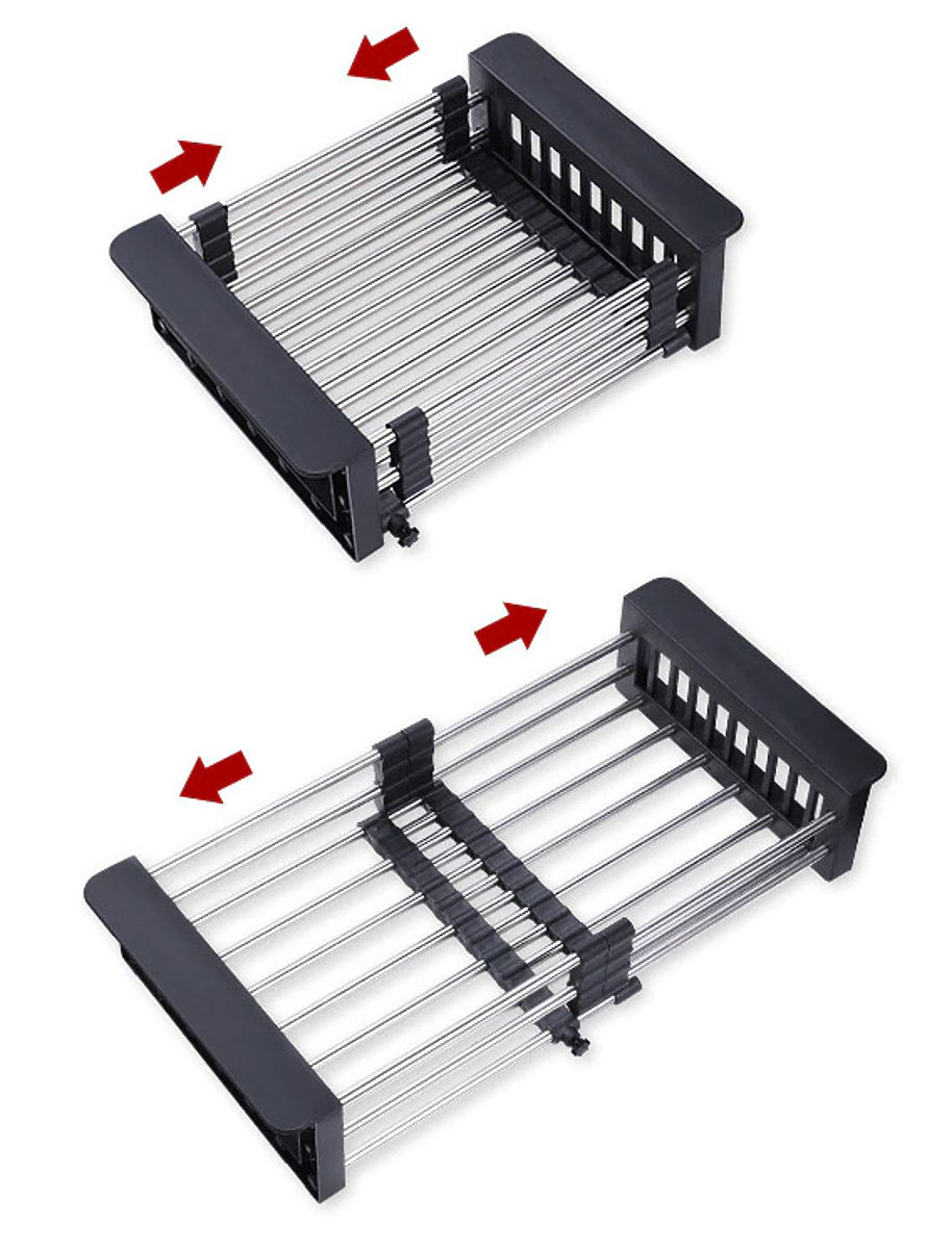 A practical and versatile drainer for vegetables and fruits. Made from durable plastic and stainless steel. Corrosion-resistant and highly durable. The telescopic design allows adjustment to the desired sink size. The basket is adjustable from 28 cm to 43 cm.