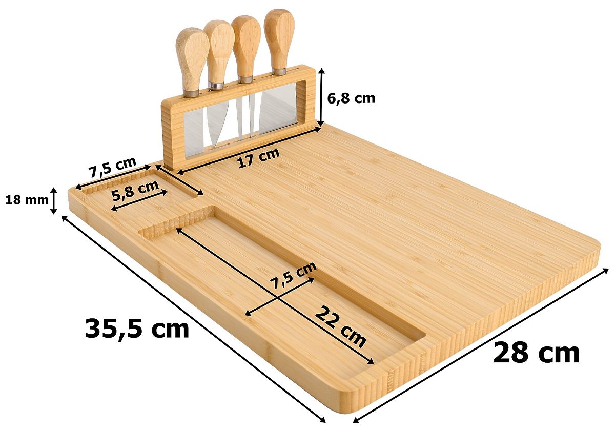 Salers Cheese and Snack Board with Cutlery Purpose: Preparation and presentation of snacks ⭐️ Perfect for serving cheese and other snacks! ⭐️ Made from 100% bamboo wood ⭐️ Stand with a complete set of stainless steel knives ⭐️ Great gift idea ⭐️ Purchase from the manufacturer ✨Salers Cheese Board with a complete set of stainless steel knives - Serve cheese like a pro!✨ The Salers Cheese Board is an elegant and practical way to serve cheese and snacks that will impress your guests. Made from 100% natural bamboo, it not only looks beautiful but is also durable and easy to maintain. With a special stand featuring stainless steel knives, everything you need is at hand, and the convenient grooves on the edges allow for an effective display of accompaniments. Ideal for parties, family gatherings, and as a gift idea, the Salers board combines functionality, aesthetics, and durability, eliminating worries about a lack of suitable accessories or mess on the table. Features Material: 100% bamboo Includes: board + complete set of stainless steel cutlery on a stand Dimensions Width: 35.5 cm Depth: 28 cm Height: 1.7 cm Additional Information The colors shown should be considered indicative - they may differ from the actual ones due to different monitor settings and photo editing processes. Actual dimensions may differ from those listed above. Error tolerance may be +/- 5%. Brand: Gockowiak EAN code: 326015MG Material: natural bamboo Board thickness: 1.5 cm Width: 35.5 cm Length: 28 cm Number of knives: four