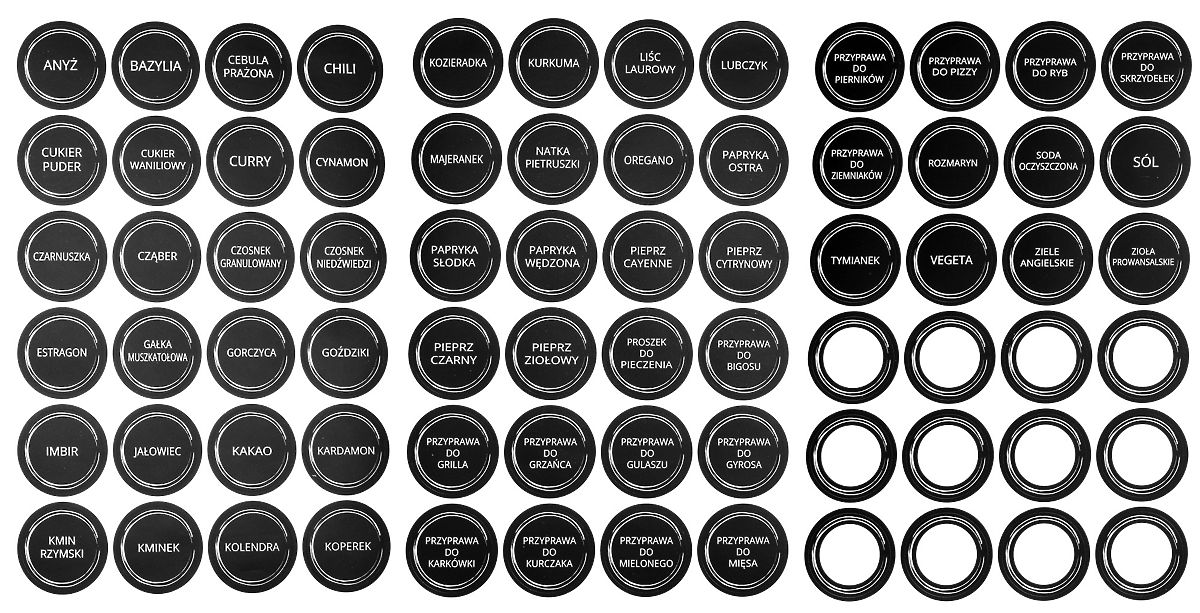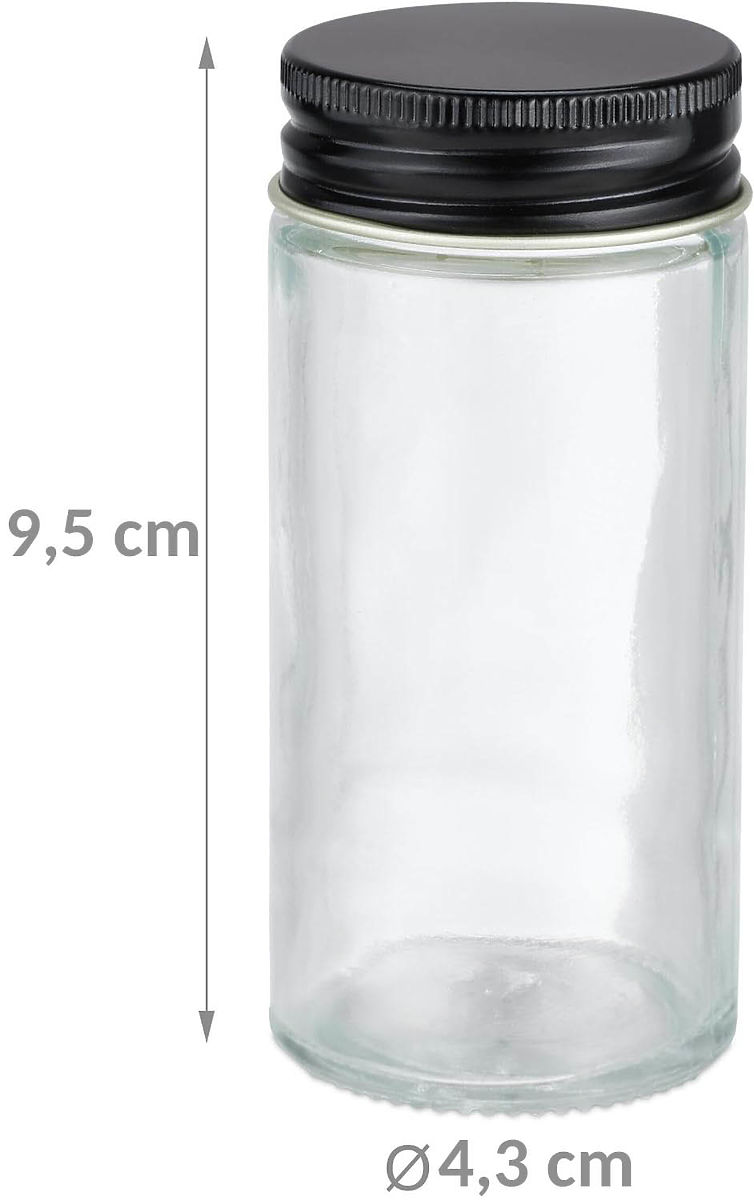 Set of 24 MARSALA Spice Jars Number of spice jars: 24 | 72 labels with spice names The Marsala spice jar set is a practical and stylish solution for any kitchen. It includes 24 glass spice jars with a capacity of 100 ml, featuring metal, black lids. Each spice jar is equipped with attachments that facilitate the dispensing of ground and coarse spices. The package also includes 72 labels with spice names, 12 of which are for custom descriptions, allowing for easy personalization. Marsala combines functionality with aesthetics, ensuring perfect order in the kitchen. Specifications: Material: glass, metal Number of spice jars in the set: 24 Shape of spice jars: round Glass color: transparent Lid color: black Weight of spice jar: 0.1 kg Volume of spice jars: 100 ml Dimensions: Height: 9.5 cm Diameter: 4.3 cm ✅ High-quality craftsmanship The spice jars are made of high-quality glass, ensuring durability and safety in use. The product is LFGB certified. ✅ Convenience of use Individual spice jars can be placed vertically or laid flat. The set also includes labels that facilitate the organization and finding of specific spices. Attachments with a dual dispensing system for spices – larger for coarse and smaller for fine spices – ensure convenience of use and prevent weathering. ✅ Large capacity The set of 24 spice jars with a capacity of 100 ml provides ample space for organizing all necessary spices. NOTE | The colors shown are indicative and may differ from actual colors due to different monitor settings and photo editing processes. • Actual dimensions may vary from those stated in the description. Error tolerance may be +/- 5%.