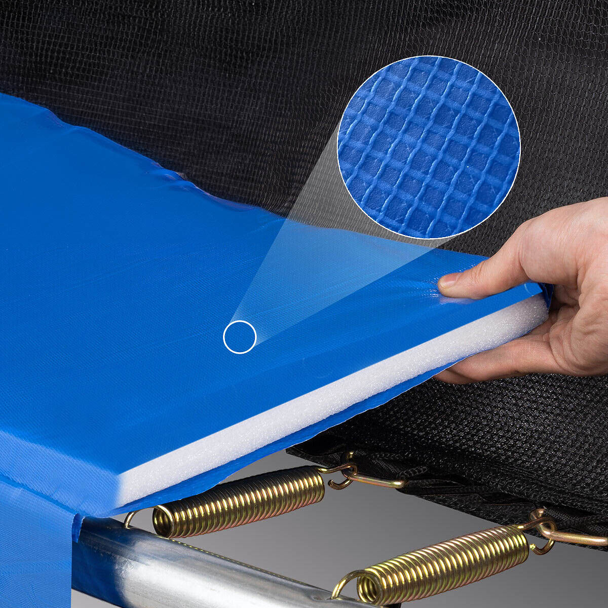 Trampoline with Safety Net and Ladder HENZEN 305 cm Blue FT10 Model: HENZEN | Color: Black / Blue ➡️Robust, Durable, and Safe The Henzen trampoline is an excellent choice for all outdoor fun enthusiasts. Made from high-quality materials, it guarantees not only long-lasting durability but also safety during use. Thanks to its robust construction and numerous safety features, the trampoline meets the highest standards of quality and safety, making it an ideal choice for both children and adults. ✔️Robust Stable Construction - The frame is made of durable galvanized steel, ensuring exceptional durability and long product life. Despite its robust construction, it is relatively lightweight, weighing only 30 kg, making it easy to transport and store. ✔️Side Edge Protection - The protective pad is made from materials: PVC + PP, providing solid protection for the side edges. ✔️Strong Elastic Mat - The main mat is made of strong and flexible plastic with a high weight of 275g/m2, making jumping on the trampoline safe and comfortable. ✔️Double Zipper with Strip and Buckles - The trampoline is equipped with a double zipper with a strip and buckles for closing the net, providing additional safety during play. ✔️Foam Pole Protectors - To further minimize the risk of injury, the model has 6 foam protectors that protect users from potential injuries. ✔️Safety Standards - The product meets the standards: PN-EN71-1, EN 71-2, EN71-3, and EN71-14, providing additional safety assurance. ✔️Curved Side Poles - The side poles are appropriately curved to prevent jumpers from accidental contact with them. ✔️High Load Capacity - The trampoline can support a maximum load of up to 150 kg, allowing free fun for both children and adults. ✔️Ladder - A practical ladder is included in the package, making it easy to enter and exit the trampoline. Children do not have to jump off the trampoline. ✔️Appropriate Frame Height - The frame is 55 cm above the ground, allowing safe jumping. Product Features Frame Material: Galvanized Steel - Weather-resistant and durable construction. Protective Pad Material: PVC + PP with a weight of 260g/m2 - provides solid protection. Jumping Mat Material: PP (Polypropylene) with a weight of 275g/m2 - for comfort and safety while jumping. Safety: Zipper with strip for closing the net, 6 foam protectors, and an additional buckle for closing the net. Safety Standards: Meets standards PN-EN71-1, EN 71-2, EN71-3, EN71-14. Maximum Load: 150 kg - fun for children and adults. Weight: Lightweight construction, only 30 kg - easy installation and transport. Product Dimensions Total Trampoline Height: 245 cm Net Height: 180 cm Frame Height from Ground: 65 cm Trampoline Diameter: 305 cm Jumping Mat Diameter: 261 cm Ladder Size: 38x75 cm Protective Pad Thickness: 12 mm Protective Pad Width: 22 cm Additional Information The presented colors should be considered indicative - they may differ from the actual ones due to different monitor settings and photo editing processes. Actual dimensions may differ from those listed above. Error tolerance may be +/- 5%. Brand: xboost EAN Code: 5905523062847 Color: Blue Total Height: 245 cm Total Width: 305 cm Frame Material: Galvanized Steel Protective Pad Material: PVC + PP Intended Use: Fun for children and adults Self-assembly: Yes