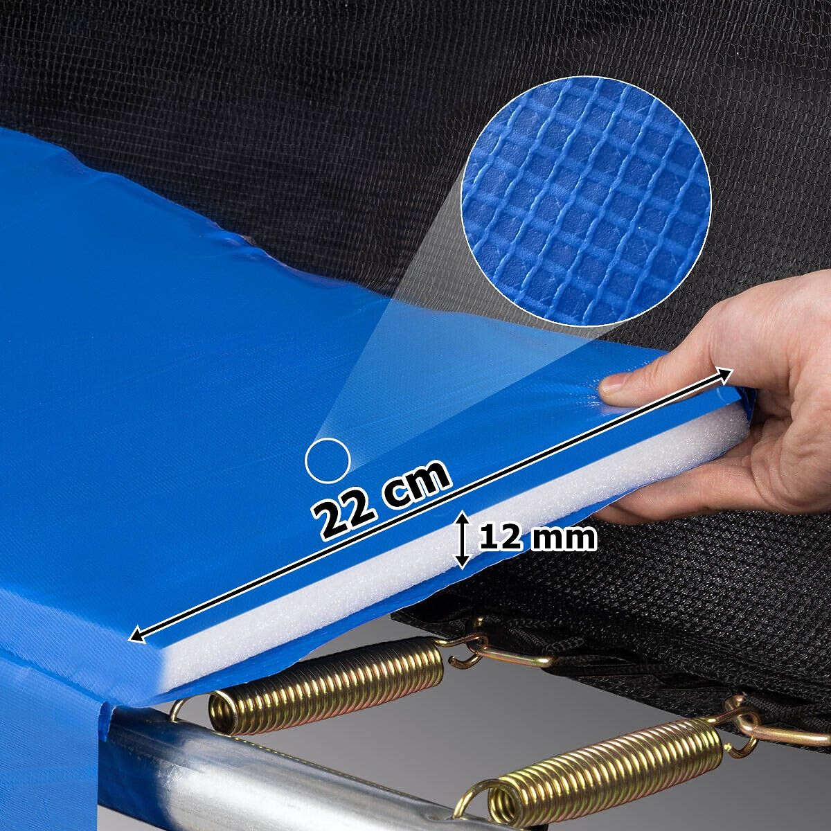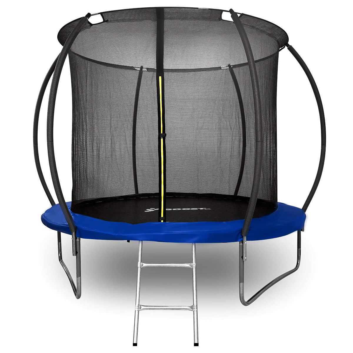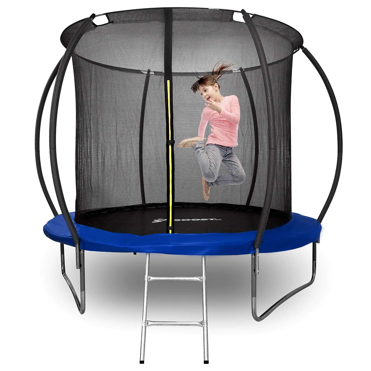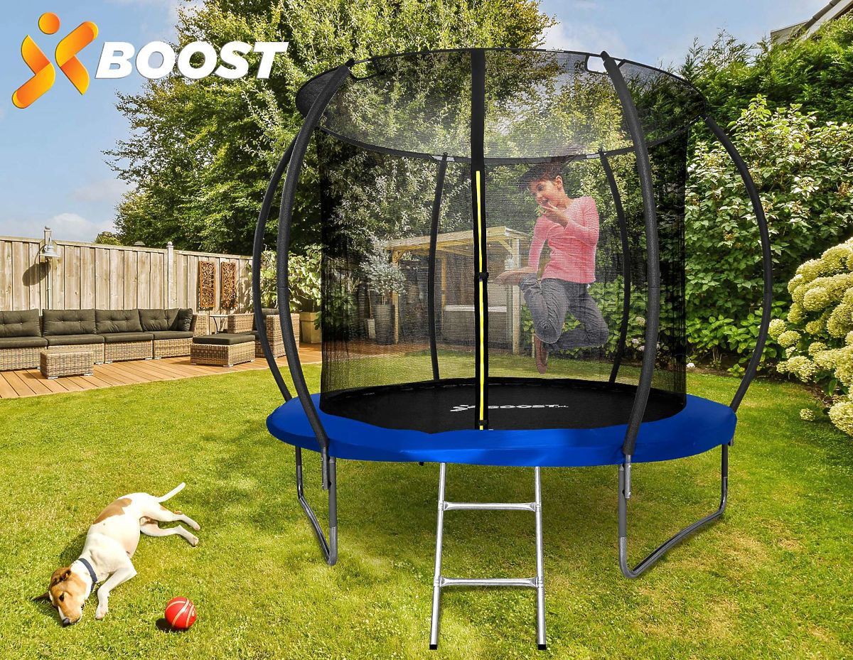 Trampoline with Net and Ladder HENZEN 244 cm Blue FT 8 Model: HENZEN | Color: Black / Blue ➡️Sturdy, Durable, and Safe The Henzen trampoline is a great choice for all outdoor fun enthusiasts. Made from high-quality materials, it ensures not only long-lasting durability but also safety during use. With its solid construction and numerous safety features, the trampoline meets the highest standards of quality and safety, making it an ideal choice for both children and adults. ✔️Sturdy Stable Construction - The frame is made of durable galvanized steel, ensuring exceptional durability and long product life. Despite its solid construction, it is relatively lightweight, weighing only 30 kg, which makes it easy to transport and store. ✔️Side Edge Protection - The protective pad is made of materials: PVC + PP, providing solid side edge protection. ✔️Strong Elastic Mat - The main mat is made of strong and flexible plastic with a high weight of 275g/m2, making jumping on the trampoline safe and comfortable. ✔️Double Zipper with Strip and Latches - The trampoline is equipped with a double zipper with a strip and latches to close the net, providing additional safety during fun. ✔️Foam Pole Protectors - To minimize the risk of injury, the model has 6 foam protectors that protect users from potential injuries. ✔️Safety Standards - The product meets standards: PN-EN71-1, EN 71-2, EN71-3, and EN71-14, providing additional safety assurance. ✔️Curved Side Poles - The side poles have an appropriately curved shape to prevent jumpers from accidental contact with them. ✔️High Load Capacity - The trampoline can support a maximum load of up to 150 kg, allowing free fun for both children and adults. ✔️Ladder - The set includes a practical ladder that facilitates entry and exit from the trampoline. Children do not have to jump off the trampoline. ✔️Suitable Frame Height - The frame is 55 cm above the ground, allowing for safe jumping. Product Features Frame Material: Galvanized steel - weather-resistant and durable construction. Protective Pad Material: PVC + PP with a weight of 260g/m2 - provides solid protection. Jumping Mat Material: PP (polypropylene) with a weight of 275g/m2 - for comfort and safety during jumping. Safety: Zipper with strip for net closure, 6 foam protectors, and an additional latch for net closure. Safety Standards: Meets standards PN-EN71-1, EN 71-2, EN71-3, EN71-14. Maximum Load: 150 kg - fun for children and adults. Weight: Lightweight construction, only 30 kg - easy to install and transport. Product Dimensions total height of the trampoline: 220 cm net height: 160 cm frame height from the ground: 55 cm diameter of the trampoline: 244 cm diameter of the jumping mat: 200 cm ladder dimensions: 38x75 cm thickness of the protective pad: 12 mm width of the protective pad: 22 cm Additional Information The presented colors should be considered indicative - they may differ from the actual ones due to different monitor settings and photo editing processes. Actual dimensions may differ from those listed above. Error tolerance may be +/- 5%. Brand: xboost EAN code: 5905523062854 Color: blue Total Height: 220 cm Total Width: 244 cm Frame Material: galvanized steel Protective Pad Material: PVC + PP Purpose: fun for children and adults Self-assembly: yes