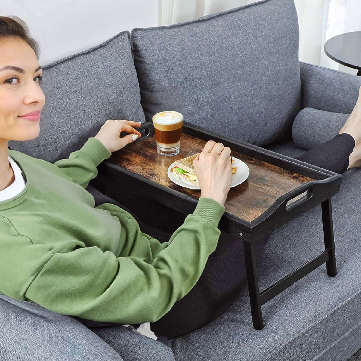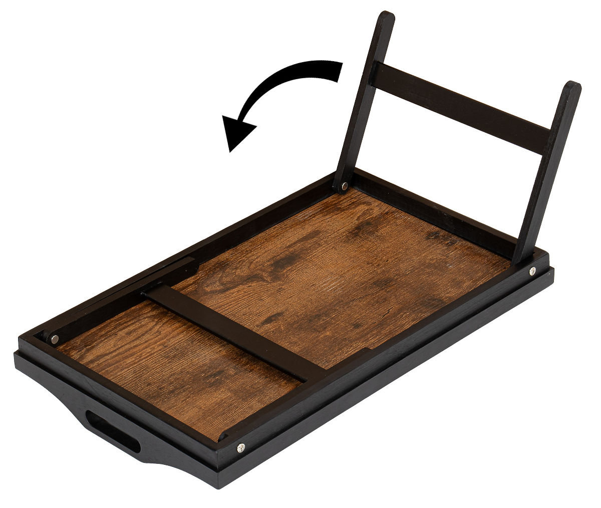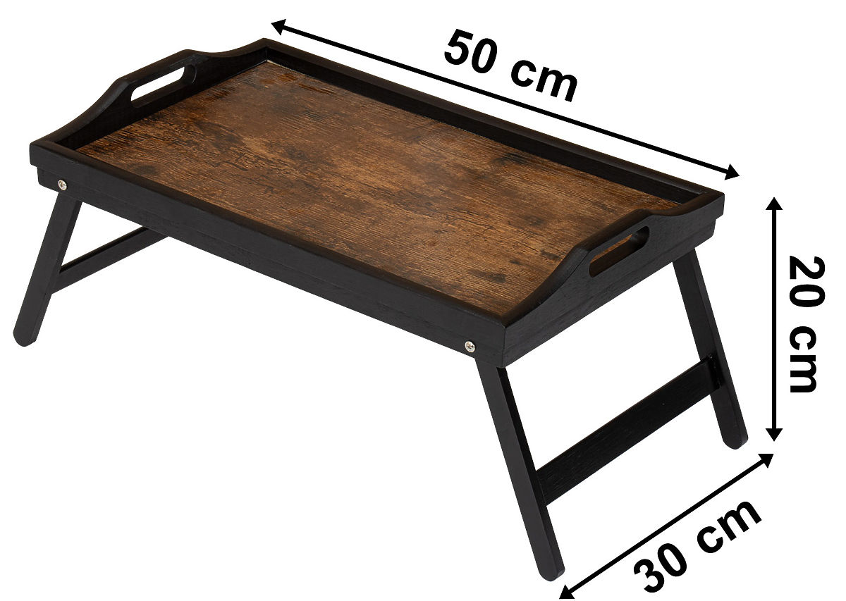 Folding Breakfast Tray AURELIA RUSTIC Color: Rustic Oak ➡️Practical and Versatile The Aurelia Rustic breakfast tray by Gockowiak is the perfect solution for lovers of eco-friendly and practical products. Made from high-quality bamboo wood and MDF board, this tray is not only durable but also charms with its natural appeal. Whether you're planning a romantic breakfast in bed, a picnic in the fresh air, or simply need a stylish addition to your kitchen, our breakfast tray will meet your expectations. It can be easily folded, making it a practical tool for storage and transport. The tray is aesthetically crafted from the highest quality materials. It facilitates meal serving, and the comfortable handles ensure stability when carrying. The Aurelia bamboo tray is not just a functional tool but also an elegant interior element. Its natural wood adds warmth and coziness to every breakfast or evening snack. The Aurelia tray is not only the perfect companion for breakfast moments but also a versatile piece of furniture that can serve various purposes. With its stable construction and comfortable handles, this tray is perfect as a portable laptop table. Whether you're working from home or need a comfortable surface for reading a book or browsing your favorite magazines, our tray is the ideal solution. Choose our bamboo breakfast tray and enjoy a unique combination of style, functionality, and ecology in one product. Add it to your collection today and highlight the unique character of your meals. Advantages: ✅Highest quality materials ✅Bamboo wood in black color ✅Aesthetic craftsmanship ✅Foldable, lightweight, and practical ✅Stable construction ✅Comfortable carrying handles ✅Universal use ✅Pleasant natural color ✅Practical and functional ✅Helpful in caring for the elderly and disabled ➡️Specifications: Material: Bamboo wood, MDF board Color: Black MDF board pattern: Rustic Oak Weight: 1.2 kg ➡️Dimensions: Unfolded dimensions: Height: 20 cm Width: 67 cm Depth: 30 cm Board dimensions: 27 x 47 cm Edge height: 1.5 cm Folded dimensions: Height: 6.5 cm Width: 50 cm Depth: 30 cm NOTE | The colors shown are indicative - they may differ from the actual ones due to different monitor settings and photo editing processes • Actual dimensions may differ from those stated in the description. Error tolerance may be +/- 5%