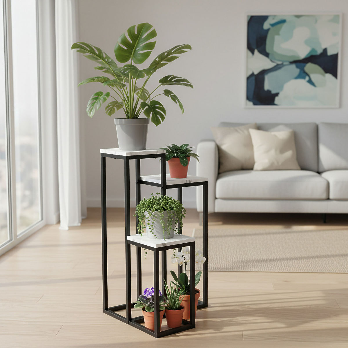 Elegant plant stand with three white marble effect shelves. .. more