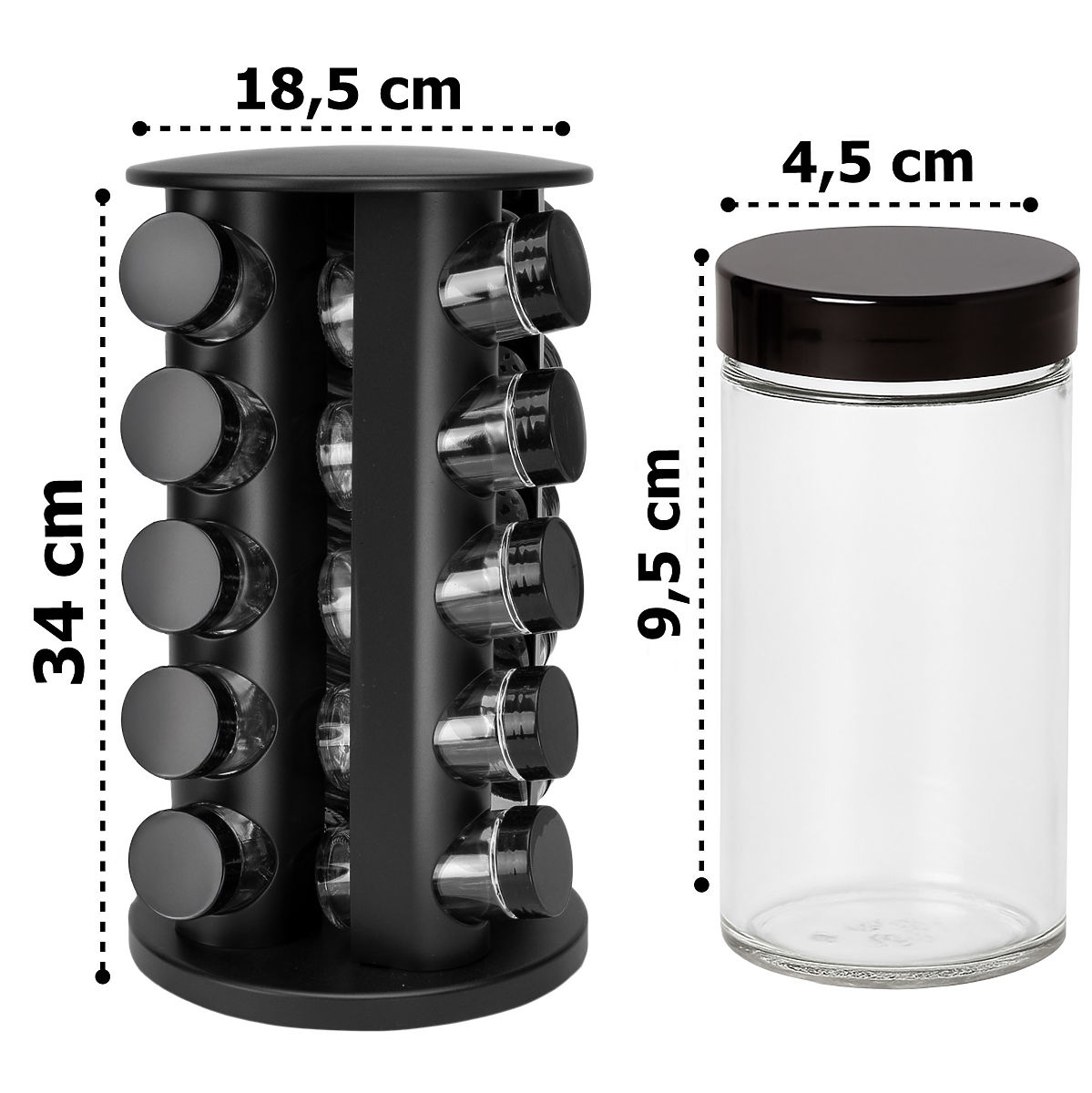 Rotating Spice Rack ROTOR BLACK 20 Jars + 72 Labels Model: ROTOR BLACK | Usage: Spice Storage ⭐️ Rotates 360 degrees ⭐️ 20 glass jars ⭐️ 72 labels and marker included ⭐️️ Purchase from the manufacturer ✔️Specifications: Jar material: glass + plastic Number of jars in set: 20 pcs Number of labels in set: 72 pcs Rotates 360 degrees Color: black Jar volume: 100 ml ✔️Stand dimensions: Height: 36 cm Width: 19.5 cm ✔️Jar dimensions: Height: 9.5 cm Width: 4.5 cm Additional information The colors shown are indicative and may differ from actual colors due to different monitor settings and photo editing processes. Actual dimensions may vary from those listed above. Error tolerance may be +/- 5%. Brand: Gockowiak Product code: 331965MG EAN code: 5902340331965 Stand height: 34 cm Stand width: 18.5 cm Number of jars: 20 Rotating: yes