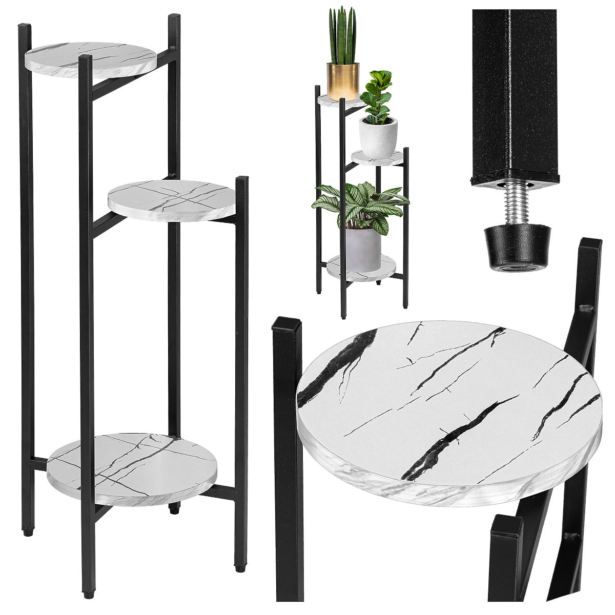 Metal Plant Stand TRETORRI White Marble ✨Practical and Elegant - Tretorri Plant Stand ✨ Tretorri is a sturdy plant stand made from steel profiles coated with powder paint and laminated boards imitating marble. It features a simple design and attractive appearance that fits perfectly into any modern interior styled in loft, modern, or glamour. The stand has a solid steel construction and stable shelves for plants and decorations, even heavier ones. It includes protective pads at the base with leveling capability. Made from the highest quality materials with attention to the smallest details. Perfect for displaying plants and showcasing their unique features. Tretorri is an exceptional plant stand with a solid construction and interesting design that cannot be overlooked. ✔️Specifications: Construction: Steel coated with powder paint Shelves: Laminated, matte, imitating marble Maximum load: 15 kg ✔️Dimensions: Overall height: 80.5 cm Overall width: 35 cm Overall depth: 35 cm Diameter of large shelf: 25 cm Diameter of small shelves: 19 cm Board thickness: 1.5 cm Construction profile: 1.5 cm ✔️Laminated, matte shelves imitating marble ✔️Adjustable feet at the base with leveling capability Uneven floor? Not a problem anymore! The stand can be adjusted to adapt to floor irregularities. Leveling is done by tightening or loosening the adjustable feet. ❓Q&A (Questions and Answers) ❓ ➡️What is the Tretorri stand made of? The Tretorri stand is made from steel profiles coated with powder paint and laminated, matte shelves imitating white marble. This combines durability with aesthetics. ➡️Is the stand stable and suitable for heavier plants? Yes, the stand has a solid steel construction and durable shelves that can easily hold heavier pots or decorations. The maximum load is 15 kg. ➡️What are the dimensions of the Tretorri stand? Height: 80.5 cm Width and depth: 35 cm Diameter of large shelf: 25 cm Diameter of smaller shelves: 19 cm Board thickness: 1.5 cm Construction profile: 1.5 cm ➡️Can the stand be leveled on an uneven floor? Yes, the stand has adjustable feet with protective pads that allow leveling on an uneven surface. Simply tighten or loosen the feet. * The colors shown in the offer are indicative - they may differ from the actual ones due to different monitor settings and photo editing processes. * Attention! Actual dimensions may differ from those stated in the offer. Error tolerance may be +/- 5%. * The offer is for 1 piece of plant stand. Decorative elements are not for sale.