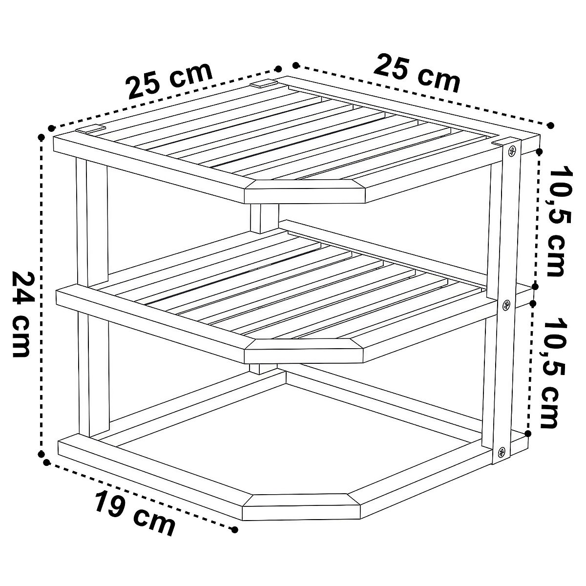 Bamboo Corner Kitchen Shelf DEDAL Model: DEDAL | Type: Corner | Use: Kitchen ⭐️100% Bamboo ⭐️3 Levels (2 Shelves + Base) ⭐️Corner Design ⭐️Versatile Use ⭐️Purchase from Manufacturer ☑️ Specifications: Material: 100% Bamboo Number of Levels: 3 Number of Shelves: 2 + Bottom Base Construction: Corner Color: Natural ☑️ Dimensions: Height: 24 cm Width: 25 cm Depth: 25 cm Spacing Between Shelves: 10.5 cm Additional Information The colors shown are indicative - they may differ from the actual ones due to different monitor settings and photo editing processes. Actual dimensions may vary from those listed. Error tolerance may be +/- 5%. Brand: Gockowiak EAN Product Code: 5902340332450 Color: Natural Height: 24 cm Width: 25 cm Depth: 25 cm Spacing Between Shelves: 10.5 cm