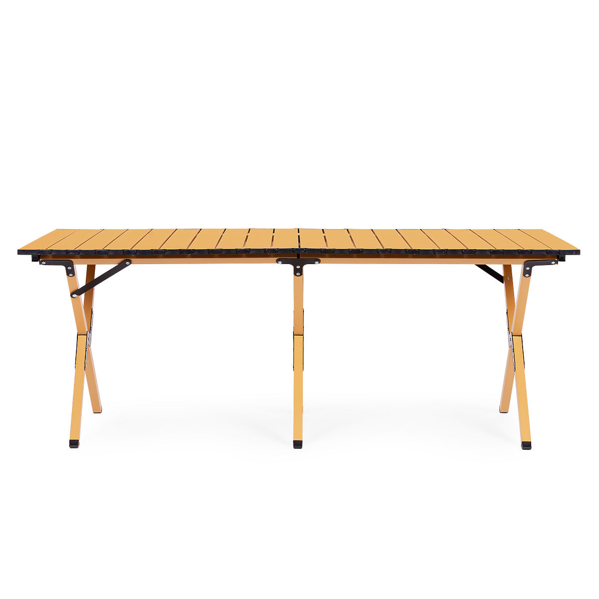 Folding camping table with a durable carbon steel frame and roll-up tabletop. .. more