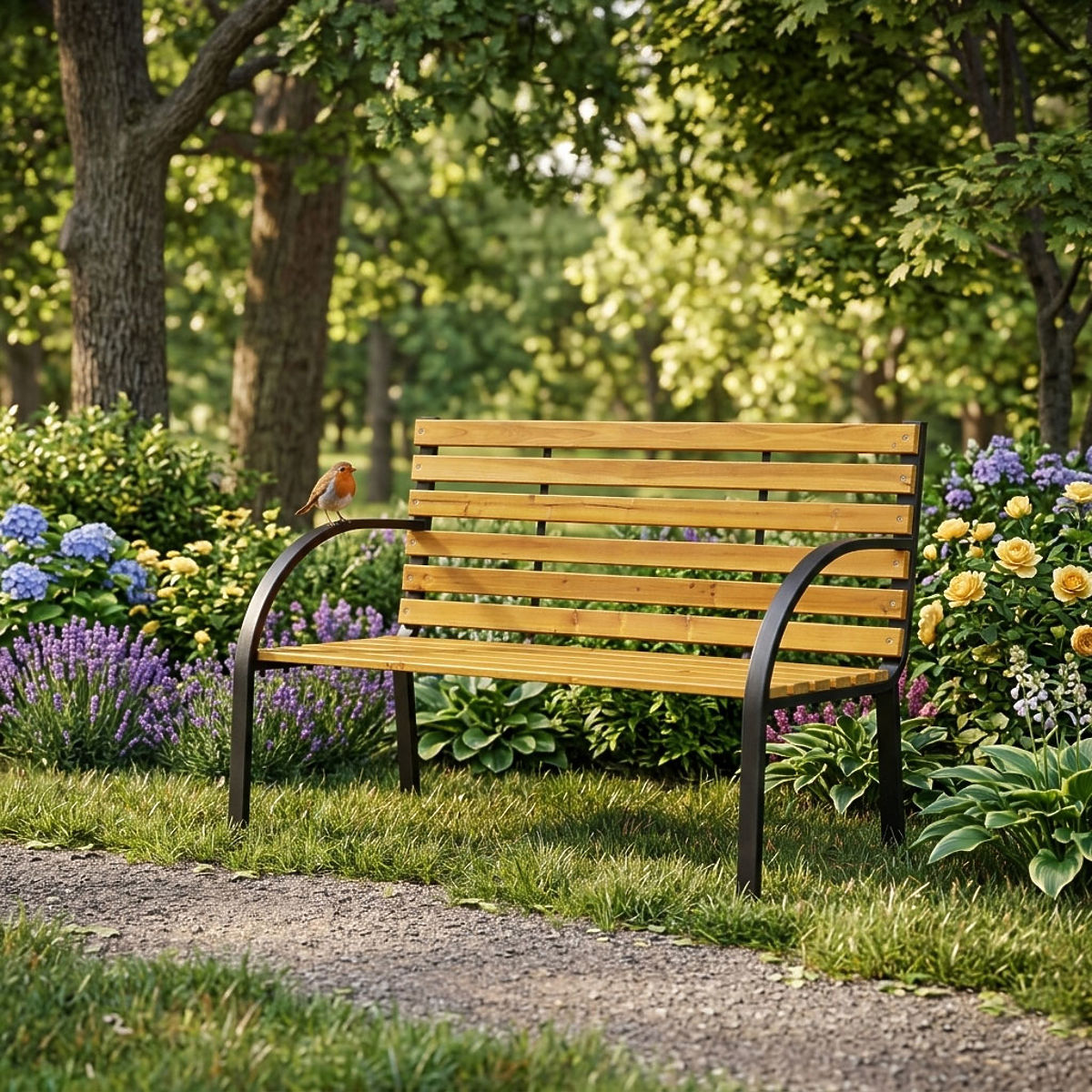 Wooden garden bench with a sturdy, weather-resistant design. .. more