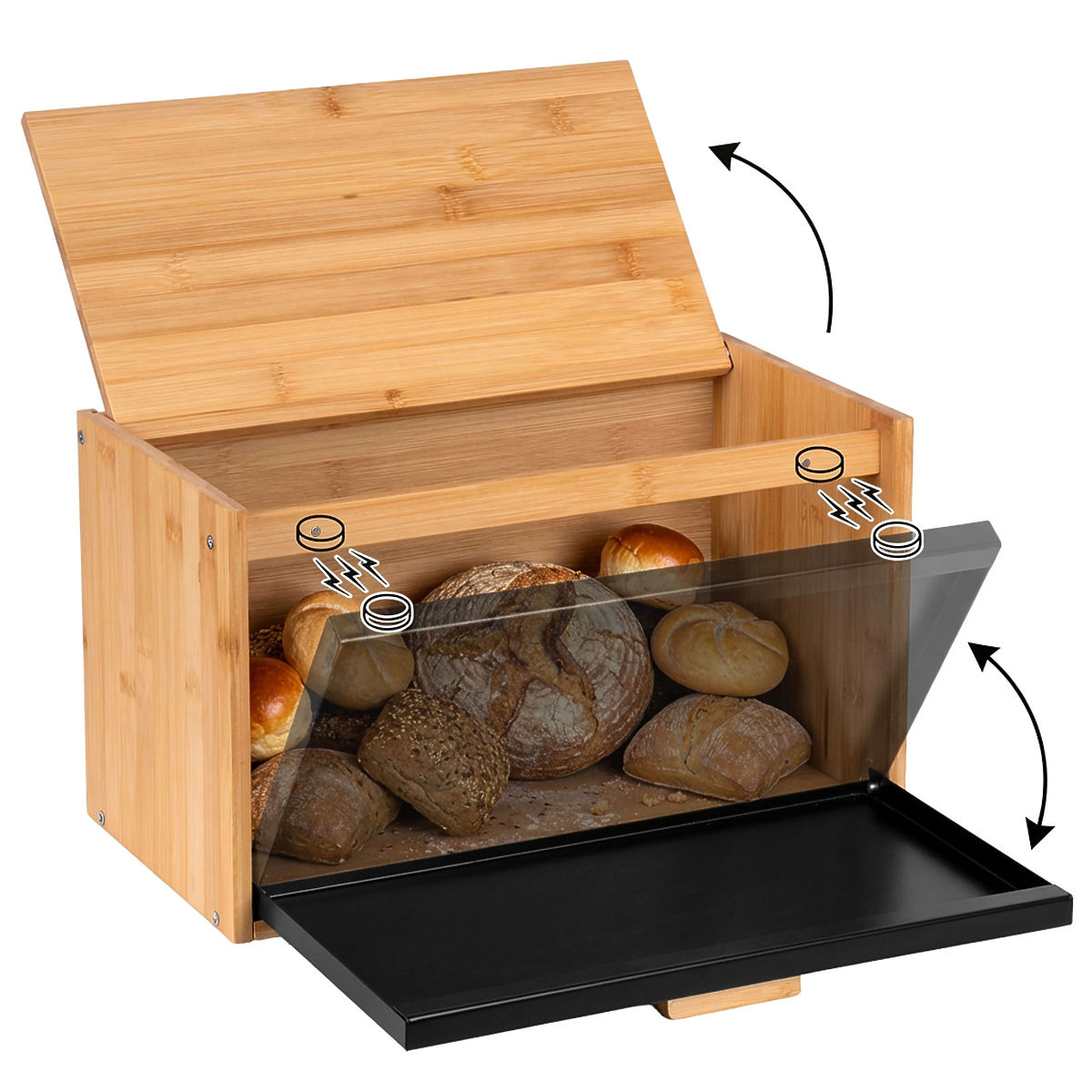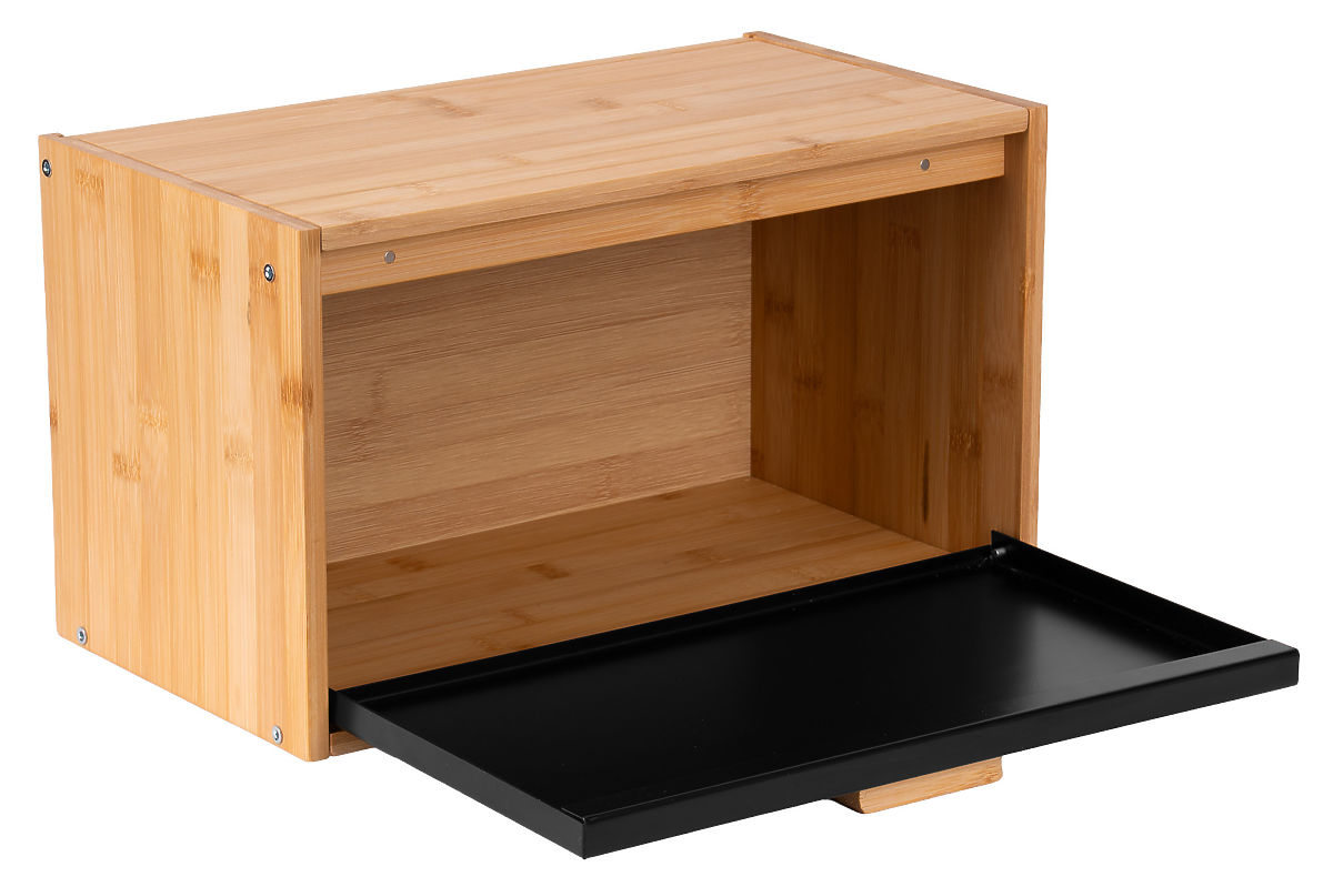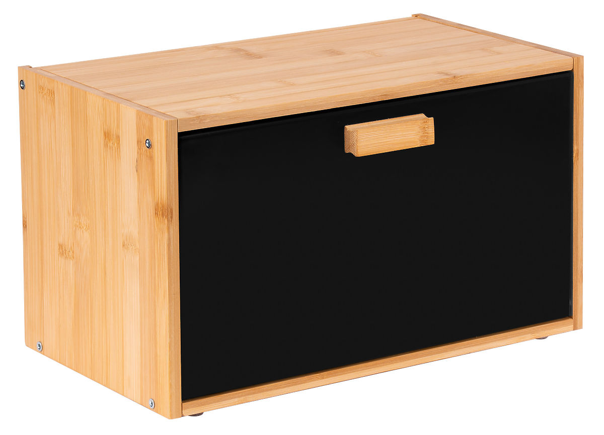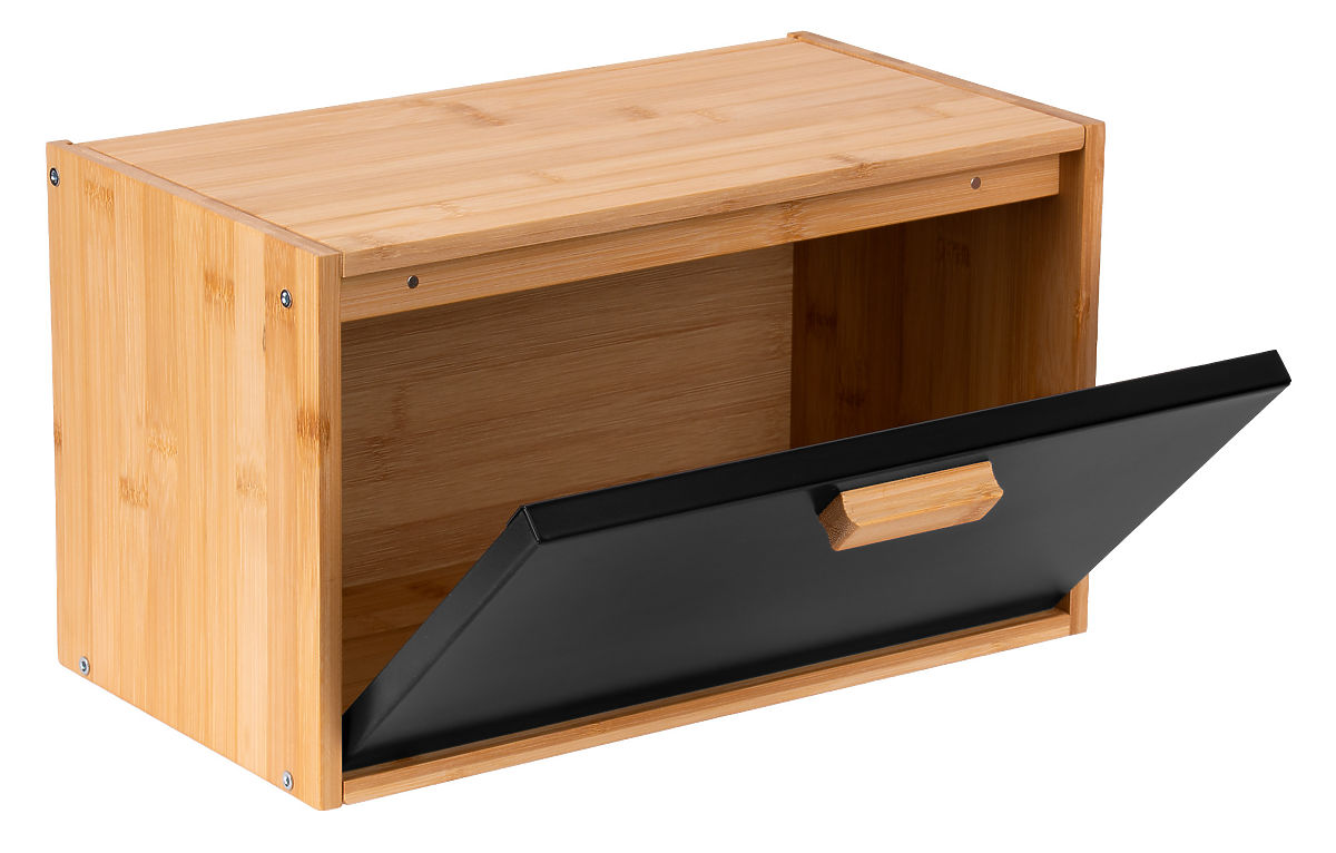Bamboo Bread Box CHARLES Model: CHARLES | Material: Bamboo+metal | Usage: Kitchen ⭐️Bamboo + metal ⭐️Magnetic drop-down door ⭐️Openable top lid ⭐️Non-slip feet ⭐️Modern design ⭐️Purchase from manufacturer ✏️ Specifications: Material: bamboo + metal Door: drop-down, magnetic Door color: matte black Top lid: openable Feet: 4 non-slip Assembly: self-assembly ✏️ Dimensions: Height: 22 cm Width: 37 cm Depth: 20.5 cm Additional information The colors shown are indicative - they may differ from actual colors due to different monitor settings and photo editing processes. Actual dimensions may differ from those listed above. Error tolerance may be +/- 5%. Brand: Gockowiak EAN product code: 5902340332443 Color: natural / black Height: 22 cm Width: 37 cm Depth: 20.5 cm