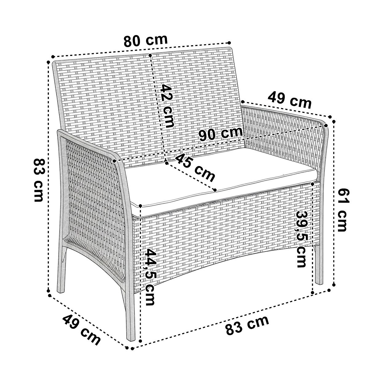 CAMELIA Black Garden Furniture Set with Black Cushions Model: Camelia | Color: Black | Includes: Sofa, Two Armchairs, and Table ⭐️ Complete Set: Sofa, 2 Armchairs, and Table ⭐️ Hydrophilic Cushions ⭐️ Tabletop Made of Transparent Tempered Glass ⭐️ Universal Black Color ⭐️ Purchase Directly from Manufacturer ✍️ Specifications: Set Includes: Sofa, Two Armchairs, Coffee Table with Glass Top Color: Black Top: Tempered Glass, 5 mm Thick Cushions: Black, 5 cm Thick Removable Cushion Covers with Zipper: Yes Maximum Chair Load: 120 kg Maximum Sofa Load: 200 kg Maximum Table Load: 25 kg Set Weight: 30.8 kg Brand: eHokery ✍️ Sofa Dimensions: Height: 83 cm Total Width: 90 cm Bottom Width: 83 cm Depth: 49 cm Backrest Width: 80 cm Backrest Height: 42 cm Backrest Height Without Cushion: 47 cm Seat Height: 39.5 cm Seat Height with Cushion: 44.5 cm ✍️ Armchair Dimensions: Height: 83 cm Total Width: 56 cm Bottom Width: 49 cm Depth: 49 cm Backrest Width: 47 cm Backrest Height: 42 cm Backrest Height Without Cushion: 47 cm Seat Height: 39.5 cm Seat Height with Cushion: 44.5 cm ✍️ Table Dimensions: Width: 70.5 cm Depth: 41 cm Height: 39 cm Glass: 68.5 x 39 cm Additional Information The colors shown are indicative and may differ from the actual colors due to different monitor settings and photo editing processes. Actual dimensions may vary from those listed above. Error tolerance may be +/- 5%. Brand: eHokery Product Code: 610359MG EAN Code: 5904512610359 Furniture Color: Black Material: Plastic Number of Set Elements: 4 Intended Use: Garden | Terrace | Balcony Self-Assembly: Yes