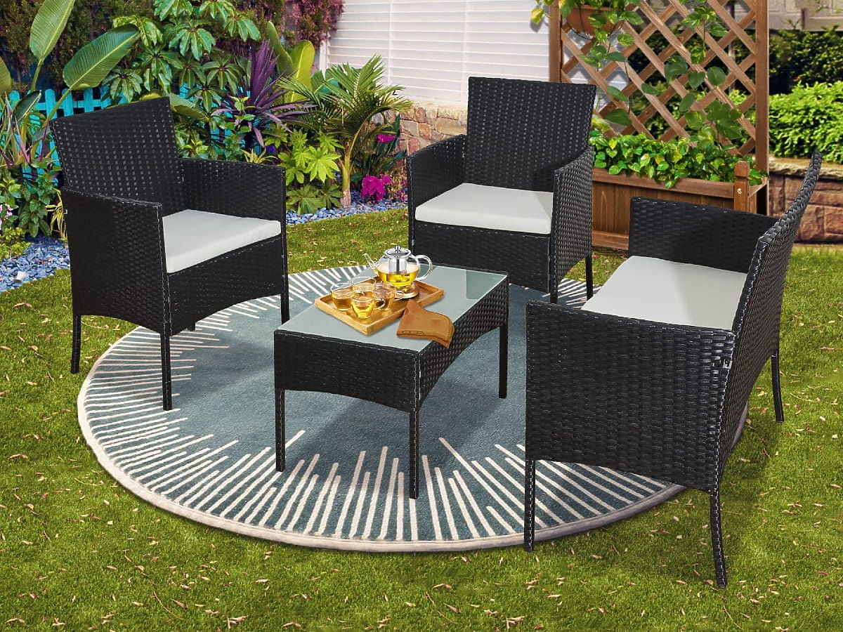 The COMODO rattan furniture set embodies simplicity and elegance, transforming any outdoor relaxation spot into a luxurious retreat. Its exquisite design creates a unique atmosphere, perfect for relaxation and leisure. Made from synthetic rattan, these furniture pieces are exceptionally resistant to all weather conditions, including rain and UV radiation, ensuring their durability and beautiful appearance for many years. The timeless elegance of the COMODO furniture ensures it fits perfectly into any environment, becoming an exceptional decoration. Additionally, COMODO furniture charms with its lightness and easy maintenance. Soft cushions and ergonomic shapes provide unparalleled comfort, while meticulous craftsmanship and attention to detail highlight their high quality. By choosing COMODO furniture, you invest in style, comfort, and durability that will delight you for many seasons. COMODO set color: black – solid Weave: technorattan 7-8mm x 1.2mm, finely striped structure Furniture construction: steel (requires simple assembly) The set consists of 4 pieces (after assembly): 2 x armchair: width: 58 cm depth: 57.5 cm height: 80 cm 1 x sofa: width: 104 cm depth: 57.5 cm height: 80 cm 1 x table (with a matte glass top made of 5mm safety glass): length: 71 cm width: 41 cm height: 37 cm Cushions are included in the set price (3 pcs for seat cushions). All have removable covers with zippers, made from water-resistant material (100% polyester), which can be washed at low temperatures. Seat cushion thickness: 5 cm. Technorattan is resistant to adverse weather conditions; however, to maintain the furniture's unchanged appearance for even longer, we recommend using and storing the product under a roof or purchasing a protective cover. The cover in dark gray is single-piece and has a drawstring at the bottom. All covers are custom-made, with a delivery time of approximately 14 working days. Photos from our customers:
