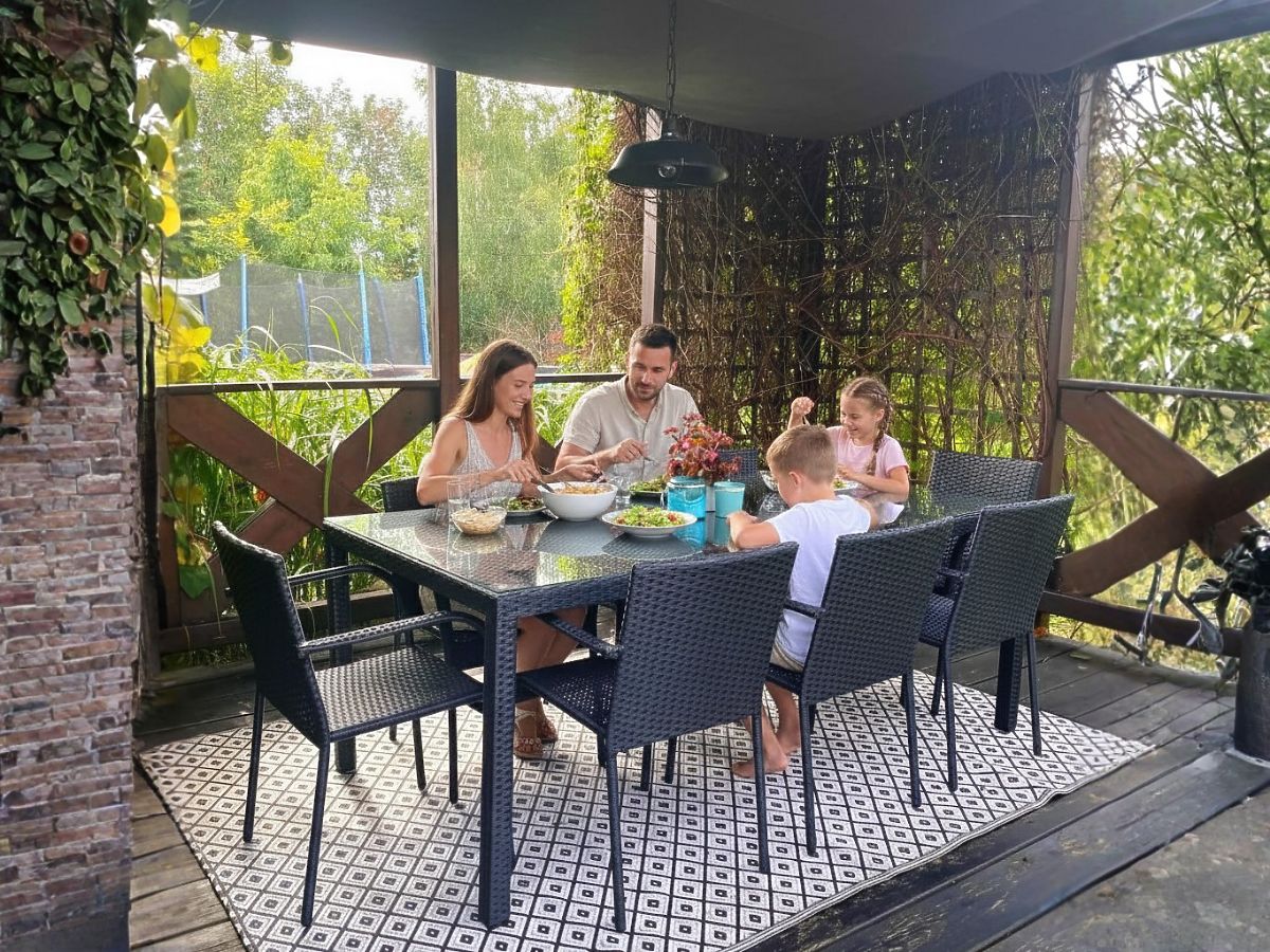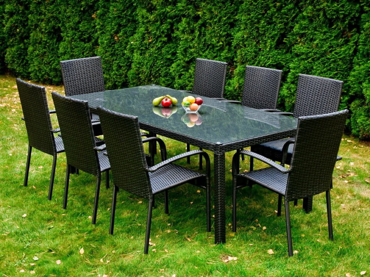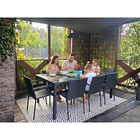 The SOTTILE garden furniture is the perfect solution for those who value elegance, comfort, and durability in garden furniture. This dining set, designed for 8 people, provides excellent conditions for gatherings with loved ones, combining extraordinary comfort with unique design. Each element of the garden set is made from high-quality technorattan, ensuring not only its longevity and resistance to adverse weather conditions but also easy maintenance. The excellent craftsmanship highlights the luxurious character of the furniture, making the SOTTILE technorattan furniture a beautiful decoration for any outdoor space. The table and chairs are resistant to rain and UV radiation, ensuring they maintain their aesthetic appearance for many years, becoming an indispensable part of any garden, terrace, or patio. SOTTILE set color: black – solid, gently striped texture. Weaving: technorattan 7-8mm x 1.2mm. Furniture construction: table – aluminum, chairs – steel. The set consists of 9 elements: 1 x table: length: 200 cm, width: 100 cm, height: 74 cm, glass, transparent top made of 5 mm safety glass, placed on technorattan weaving. 8 x chairs: width: 56 cm, depth: 50 cm, height: 84 cm, height from floor to seat: 44 cm, backrest height from seat: 43 cm, seat width: 40 cm, seat depth: 43 cm. The set is shipped on 1 pallet with dimensions 120x80x210 cm, weight 80 kg. Chairs can be used immediately after being taken out of the boxes. The chairs are stackable (can be nested into each other), which makes storage easier and the furniture does not take up much space. The table is designed for simple, self-assembly according to the included instructions. The glass table top is secured with silicone suction cups to prevent sliding. You can purchase cushions for the chairs here. Technorattan is resistant to adverse weather conditions, but for even longer preservation of the furniture's appearance, we recommend purchasing a protective cover. The cover in dark gray is one-piece and has a drawstring at the bottom. All covers are custom-made and the delivery time is approximately 14 working days. Imagine garden furniture that exceeds your expectations in every way – from durability to design. This is BELLO GIARDINO, where every detail matters and luxury meets functionality: Timeless quality: Our synthetic rattan guarantees that the furniture will last for years without losing its beauty or durability. Weather resistance: Our furniture withstands the harshest weather conditions, from scorching sun to freezing winters, remaining beautiful. Luxurious comfort: Thick, soft cushions invite relaxation, offering comfort that's hard to find elsewhere. Lightness and strength: The aluminum construction combines the best of both worlds – it's lightweight yet exceptionally stable. Design that enchants: Every element of our furniture is designed with aesthetics and functionality in mind, to fit any environment. Whether you are a lover of minimalism or appreciate rich, elegant arrangements, our furniture will meet your expectations, surpassing the boundaries of ordinary functionality and aesthetics. We ensure that even the most demanding customers will not resist the comfort and style offered by BELLO GIARDINO. Turn your garden, terrace, or balcony into an oasis of relaxation and elegance you've always wanted. Don't wait, discover BELLO GIARDINO today and transform your outdoor spaces into places you've always dreamed of. Photos of furniture from our customers: