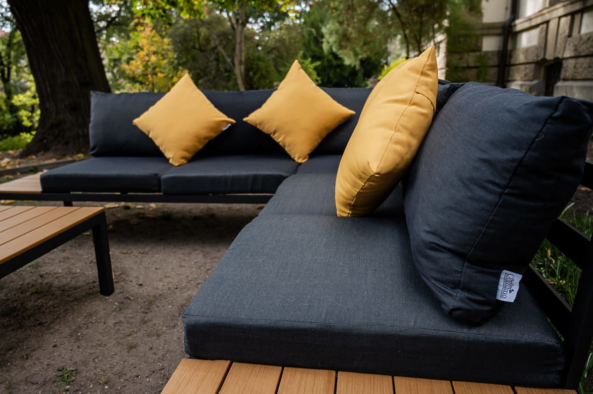 This exclusive garden furniture set is made from the highest quality powder-coated aluminum, ensuring not only resistance to rain, wind, and harmful UV rays but also captivating with its appearance. The MASSIMO garden furniture has a black frame that beautifully contrasts with the comfortable gray cushions, creating an ideal combination that fits into any home environment. The aluminum relaxation furniture combines class and high-quality craftsmanship, offering not only comfort and functionality but also adding an elegant character to any garden, terrace, or balcony. It is the perfect solution for those who value timeless design and long-lasting quality. MASSIMO set color: black Cushion color: gray Furniture construction: aluminum Set composed of 4 elements: 2 x side module (right and left): width: 168 cm depth: 72 cm height: 67 cm 1 x corner module: width: 72 cm depth: 72 cm height: 67 cm 1 x table (top made of polywood): length: 90 cm width: 70 cm height: 35 cm Additional dimensions: Seat height of modules: 30 cm + 10 cm cushion Backrest height from seat: 38 cm Sofa seat dimensions: 67 cm x 132 cm Shelf dimensions: 69 cm x 35 cm Backrest width: 2 cm Back cushions protrude 12 cm above the backrest edge The set is shipped on 1 pallet with dimensions 120x80x190 cm, weight 70 kg Cushions in gray for seats and backrests included in the set (5 pcs for seats, 6 pcs for backrests). All have removable zip covers made from outdoor material (100% polyester), which can be washed at low temperatures. The cushion covers are made from high-quality fabric coated with Teflon, protecting them from moisture. The cushion filling is made from high-quality upholstery foam (medium hard - T25), preventing deformation. Cushion thickness for seat: 10 cm, Cushion thickness for backrest: 20 cm. Option to sew cushions to individual order for this set: https://www.bg-meble.pl/pl/p/Usluga-Krawiecka-Poduszki-Na-Zamowienie-/742 Option to sew cushion covers to individual order for this set: https://www.bg-meble.pl/pl/p/Usluga-Krawiecka-Poszewki-Na-Zamowienie/743 Imagine garden furniture that exceeds your expectations in every way – from durability to design. Here is BELLO GIARDINO, where every detail matters and luxury meets functionality: Unchanging quality: Our synthetic rattan guarantees that the furniture will last for years without losing beauty or durability. Weather resistance: Our furniture withstands the toughest weather conditions, from scorching sun to freezing winters, remaining beautiful. Luxurious comfort: Thick, soft cushions invite relaxation, offering comfort hard to find elsewhere. Lightness and durability: Aluminum construction combines the best of both worlds – it's lightweight yet extremely stable. Design that enchants: Every element of our furniture is designed with aesthetics and functionality in mind, fitting into any environment. Whether you are a fan of minimalism or appreciate rich, elegant arrangements, our furniture will meet your expectations, surpassing the boundaries of ordinary functionality and aesthetics. We guarantee that even the most demanding customers will not resist the comfort and style offered by BELLO GIARDINO. Turn your garden, terrace, or balcony into an oasis of relaxation and elegance that you've always wanted. Don't wait, discover BELLO GIARDINO today and transform your outdoor spaces into places you've always dreamed of.