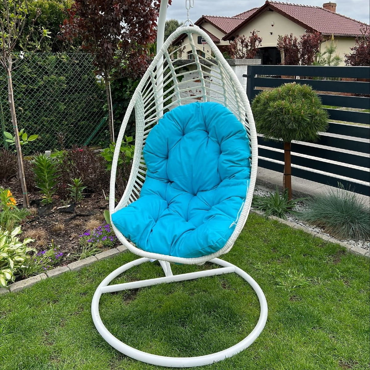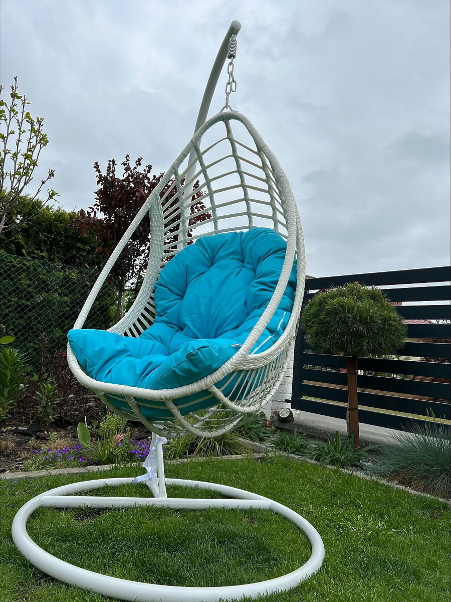This extravagant hanging chair is a true masterpiece of design, created for those seeking a blend of luxury, comfort, and unique style in their outdoor spaces. The original shape and fashionable design of this technorattan chair perfectly fit any balcony or terrace arrangement, creating an exclusive place for relaxation. The cocoon is made from high-quality technorattan on a stable steel frame, ensuring resistance to adverse weather conditions, including rain and harmful UV radiation. The weave retains its color and shape for years, ensuring durability and aesthetic appearance. Additionally, the elegant cushion not only enhances resting comfort but also adds class and extraordinary charm to the entire furniture, making it the focal point of any outdoor relaxation space. The technorattan hanging chair is not just furniture, but a true expression of attention to detail and the highest quality of relaxation. Color: white, solid Weave: technorattan 7-8mm x 1.2mm, smooth structure Construction: steel Color gray available for purchase here. 1 x cocoon: total height: 195 cm base diameter: 105 cm cocoon height: 117 cm seat depth: 60 cm width: 79 cm The cocoon requires no assembly. 10 cm blue cushion (product gallery) included in the cocoon price The cocoon frame does not require the use of a fastening strap. The chair is shipped on 1 pallet with dimensions 120x80x180 cm, weight 45 kg Usage rules for BELLISSIMO Cocoon Bello Giardino: Maximum load: 100 kg. Children under 13 years old may use the cocoon only under adult supervision. Special care is recommended to prevent the cocoon from tipping over. The waterproof surface repels water, protecting the fabric from stains and dirt. However, remember that during prolonged heavy rain, it may get wet, so we recommend using a protective cover. Technorattan is resistant to harmful weather effects, but to maintain the unchanged appearance of the furniture for longer, we recommend using and storing the product under a shelter or purchasing a protective cover. The dark gray cover is one-piece and has a drawstring at the bottom, threaded through metal eyelets. All covers are custom-made, and the delivery time is approximately 21 working days. Imagine garden furniture that exceeds your expectations in every way – from durability to design. This is BELLO GIARDINO, where every detail matters, and luxury meets functionality: Indestructible quality: Our synthetic rattan guarantees that the furniture will last for years without losing its beauty or durability. Weather resistance: Our furniture withstands the toughest weather conditions, from scorching sun to freezing winters, remaining beautiful. Luxurious comfort: Thick, soft cushions invite relaxation, offering comfort hard to find elsewhere. Lightness and durability: The aluminum construction combines the best of both worlds – it is lightweight yet exceptionally stable. Design that impresses: Every element of our furniture is designed with aesthetics and functionality in mind, to fit any environment. Whether you are a lover of minimalism or appreciate rich, elegant arrangements, our furniture will meet your expectations, surpassing the boundaries of ordinary functionality and aesthetics. We guarantee that even the most demanding customers will not resist the comfort and style offered by BELLO GIARDINO. Turn your garden, terrace, or balcony into an oasis of relaxation and elegance you've always wanted. Don't wait, discover BELLO GIARDINO today and transform your outdoor spaces into the places you've always dreamed of. Photos of furniture from our customers: