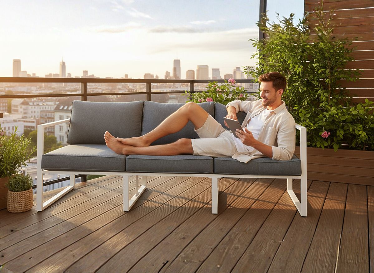 The MOSTRARE garden sofa combines the simplicity of minimalism with perfect craftsmanship, making it an ideal addition to a modern outdoor space arrangement. This relaxation sofa will surely add style and class to any garden, terrace, or balcony thanks to its durable powder-coated aluminum construction and thick, comfortable cushions that ensure maximum relaxation comfort. The MOSTRARE balcony sofa is not only a practical but also an aesthetic choice that will serve for years, maintaining its beauty and functionality regardless of weather conditions. MOSTRARE sofa color: white Cushion color: gray melange Furniture construction: aluminum (requires simple assembly) 1 x sofa: width: 204 cm depth: 67 cm height: 63 cm Additional dimensions: Armrest width: 4 cm Sofa seat height: 30 cm + 10 cm cushion Sofa seat dimensions: 194 cm x 65 cm Backrest height from seat: 34 cm Seat cushions fastened with Velcro The sofa is shipped on 1 pallet with dimensions 80x60x210 cm, weight 30 kg Cushions in gray color included in the set (3 pieces for seats, 3 pieces for backrests). All have removable zip covers made of outdoor material (100% polyester), which can be washed at low temperatures. The cushion covers are sewn from high-quality fabric coated with Teflon, protecting them from moisture. The cushion filling is made of high-quality upholstery foam (medium hard - T25), which prevents deformation. Cushion thickness on the seat: 10 cm. Option to sew cushions to individual order for this set: https://www.bg-meble.pl/pl/p/Usluga-Krawiecka-Poduszki-Na-Zamowienie-/742 Option to sew cushion covers to individual order for this set: https://www.bg-meble.pl/pl/p/Usluga-Krawiecka-Poszewki-Na-Zamowienie/743 To enjoy the unchanged appearance of the furniture even longer, we recommend purchasing a protective cover. The cover in dark gray color is one-piece and has a drawstring at the bottom. All covers are made to order, and the delivery time is approximately 14 working days. PHOTOS FROM OUR CUSTOMERS: Imagine garden furniture that exceeds your expectations in every way – from durability to design. Here is BELLO GIARDINO, where every detail matters and luxury meets functionality: Timeless quality: Our synthetic rattan guarantees that the furniture will last for years without losing its beauty or durability. Weather resistance: Our furniture withstands the toughest weather conditions, from scorching sun to freezing winters, remaining beautiful. Luxurious comfort: Thick, soft cushions invite you to relax, offering comfort that is hard to find elsewhere. Lightness and durability: The aluminum construction combines the best of both worlds – it is lightweight yet extremely stable. Design that enchants: Every element of our furniture is designed with aesthetics and functionality in mind, fitting into any environment. Whether you are a lover of minimalism or appreciate rich, elegant arrangements, our furniture will meet your expectations, surpassing the boundaries of ordinary functionality and aesthetics. We ensure that even the most demanding customers will not resist the comfort and style offered by BELLO GIARDINO. Turn your garden, terrace, or balcony into an oasis of relaxation and elegance that you've always wanted. Don't wait, discover BELLO GIARDINO today and transform your outdoor spaces into the places you've always dreamed of.