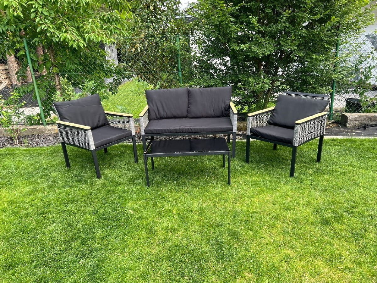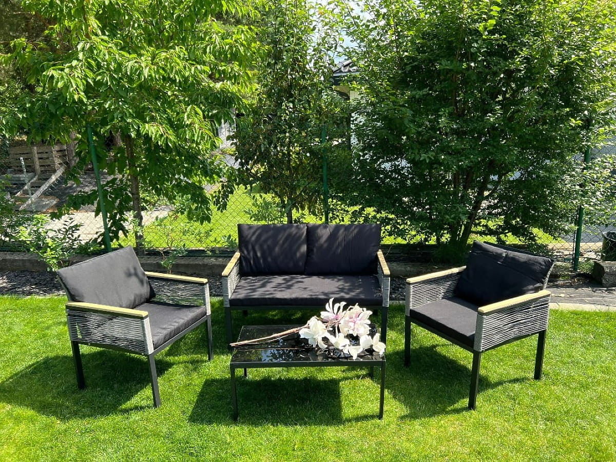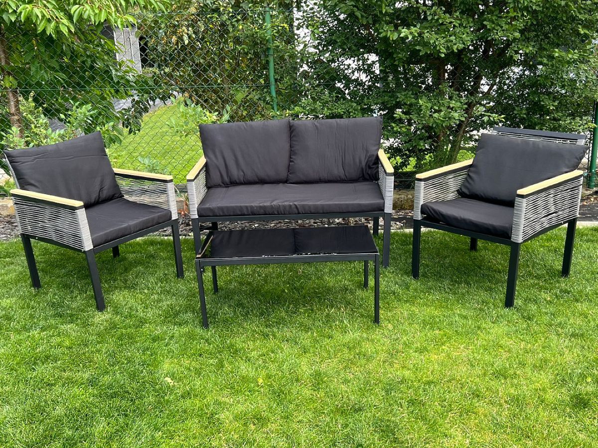 This furniture set is the quintessence of comfort and design, an invitation to create a unique oasis of tranquility in your garden, terrace, or balcony. It is the perfect choice for those who want to transform their outdoor space into a masterpiece of functionality and aesthetics. This exceptionally original set, characterized by its compact format, fits perfectly even in the coziest corners. Made from aluminum, it is weather-resistant, ensuring its phenomenal durability and flawless shine for many years. If you dream of the perfect combination of elegance, reliability, and deep relaxation in the fresh air, this set is a bullseye. It will become an icon of style in your outdoor arrangement, brightening it with unique character and inviting endless moments of relaxation. CORTO set color: black, solid Weave: round technorattan Furniture construction: aluminum (requires simple assembly) Armrests finished with polywood The set consists of 4 elements (after assembly): 2 x chair: width: 61 cm depth: 72 cm height: 78 cm 1 x sofa: width: 116 cm depth: 72 cm height: 78 cm 1 x table (polywood top): length: 84 cm width: 45 cm height: 37 cm Black cushions included in the set (3 pcs for seats, 4 pcs for backrests). All have removable covers with zippers, made from outdoor material (100% polyester), which can be washed at low temperatures. The cushion covers are sewn from high-quality fabric coated with Teflon, protecting them from moisture. The cushion filling is made from high-quality upholstery foam (medium-hard - T25), preventing deformation. Cushion thickness: 5 cm Option to sew cushions to order for this set: https://www.bg-meble.pl/pl/p/Usluga-Krawiecka-Poduszki-Na-Zamowienie-/742 Option to sew cushion covers to order for this set: https://www.bg-meble.pl/pl/p/Usluga-Krawiecka-Poszewki-Na-Zamowienie/743 Option to order only the complete set. Set for self-assembly according to the included instructions. A complete set of screws and keys is included with the set. Technorattan is resistant to harmful weather effects, but for even longer preservation of the unchanged appearance of the furniture, we recommend purchasing a protective cover. The cover in dark gray is one-piece and has a drawstring at the bottom, threaded through metal eyelets. All covers are custom-made, and the delivery time is approximately 14 working days. Imagine garden furniture that exceeds your expectations in every way – from durability to design. Here is BELLO GIARDINO, where every detail matters and luxury meets functionality: Timeless quality: Our synthetic rattan guarantees that the furniture will last for years without losing its beauty or durability. Weather resistance: Our furniture withstands the most demanding weather conditions, from scorching sun to freezing winters, remaining beautiful. Luxurious comfort: Thick, soft cushions invite relaxation, offering comfort that is hard to find elsewhere. Lightness and strength: The aluminum construction combines the best of both worlds – it is lightweight yet exceptionally stable. Design that enchants: Every element of our furniture is designed with aesthetics and functionality in mind, to fit into any environment. Whether you are a fan of minimalism or appreciate rich, elegant arrangements, our furniture will meet your expectations, surpassing the boundaries of ordinary functionality and aesthetics. We ensure that even the most demanding customers will not resist the comfort and style offered by BELLO GIARDINO. Turn your garden, terrace, or balcony into an oasis of relaxation and elegance that you have always wanted. Don't wait, discover BELLO GIARDINO today and transform your outdoor spaces into the places you've always dreamed of.