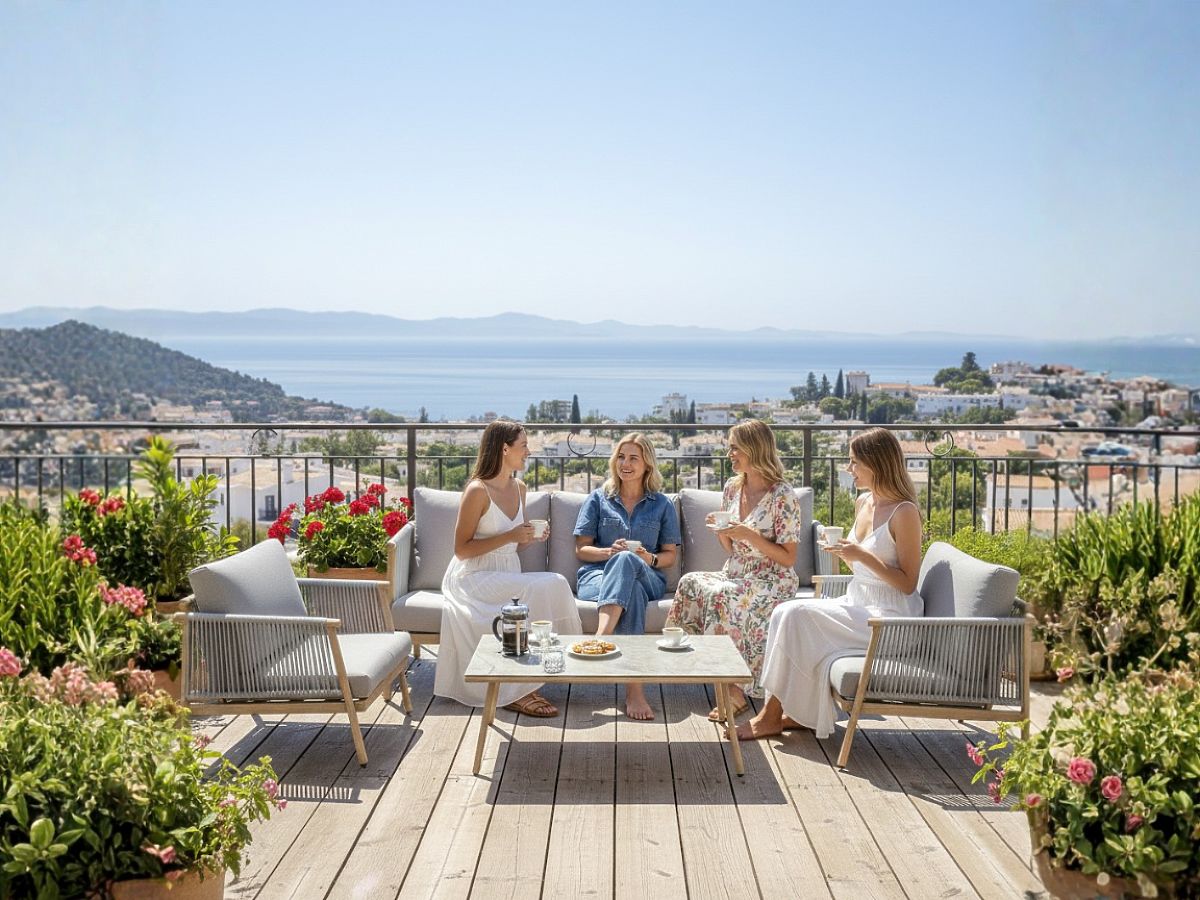 Luxurious aluminum patio set with sofa, armchairs, and table. .. more