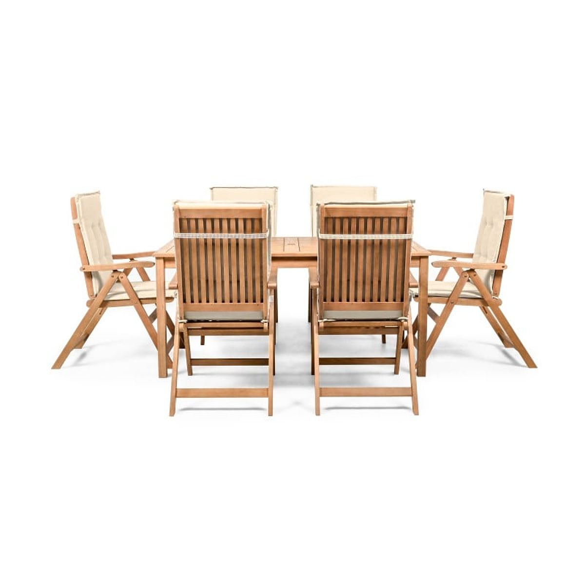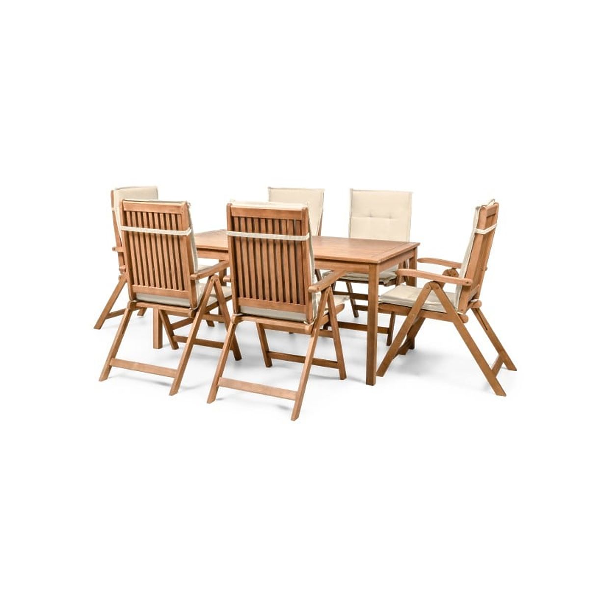 Lukahome.eu » Garden furniture / Garden sets / Garden Set Familis Table 160 cm + 6 Chairs with Adjustable Backrests and Cream Cushions, Wood