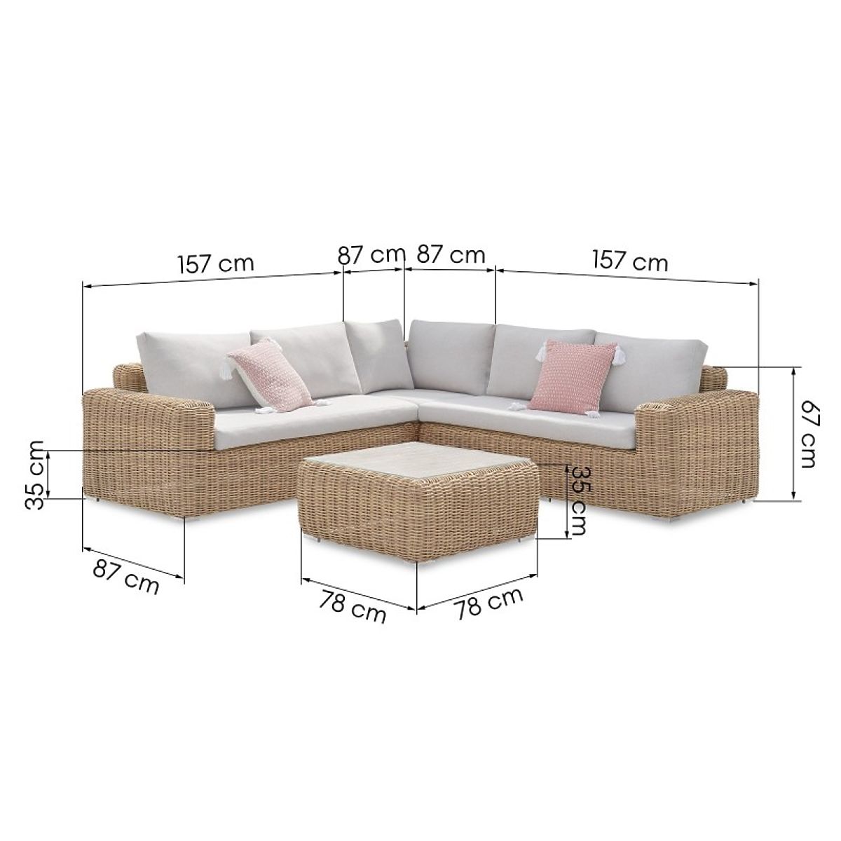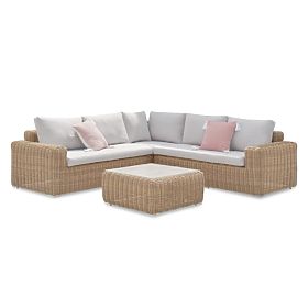 The Sandy garden corner sofa is an elegant relaxation set with a comfortable table and soft cushions, perfect for unwinding in the garden. Made from durable synthetic rattan, it combines style and comfort, making it a great fit for any outdoor space.